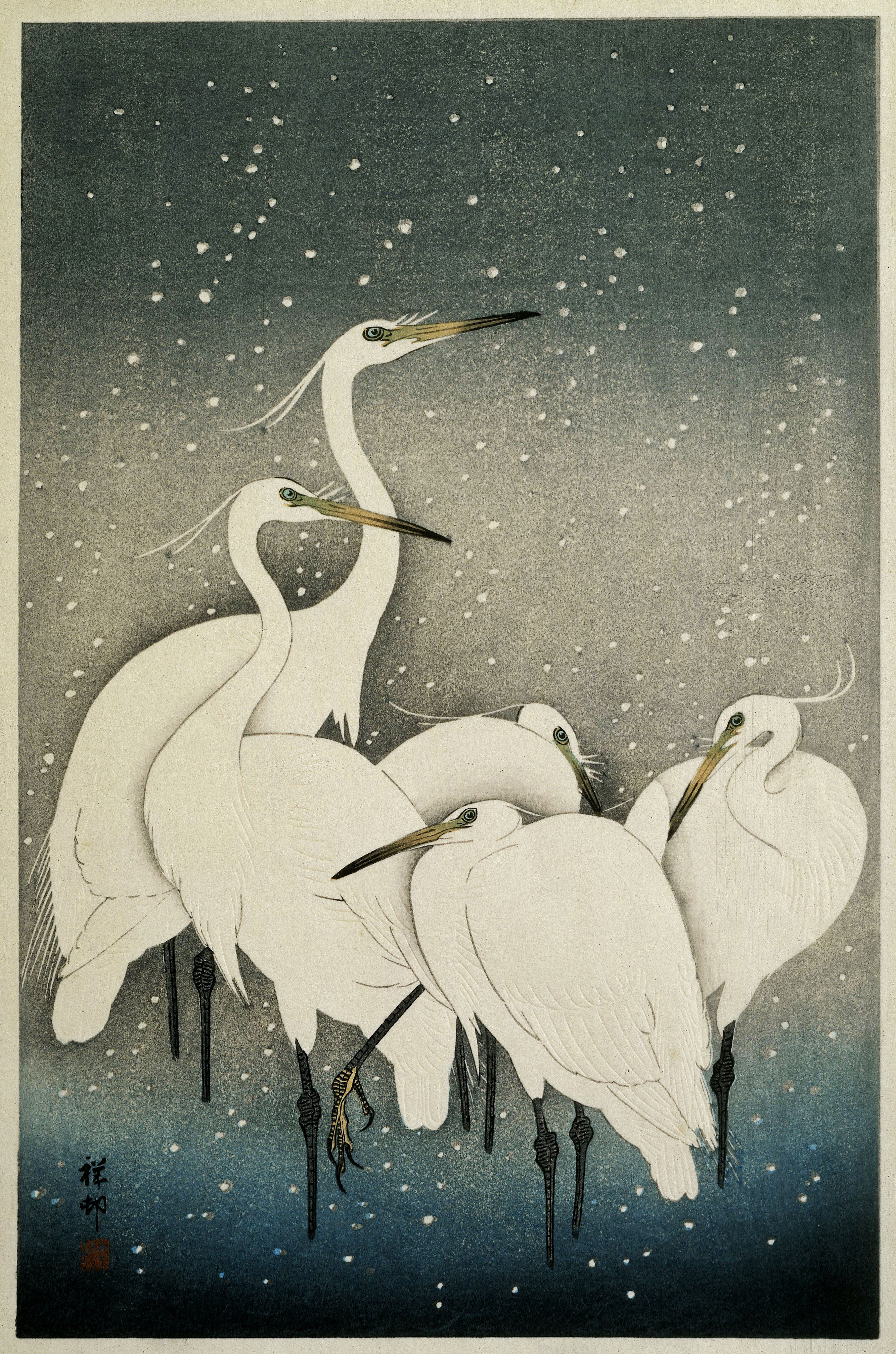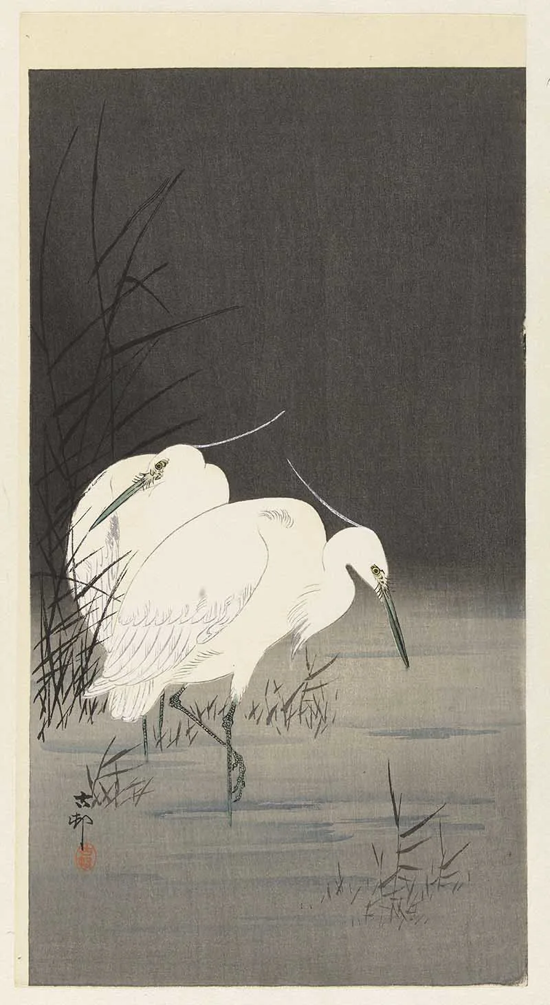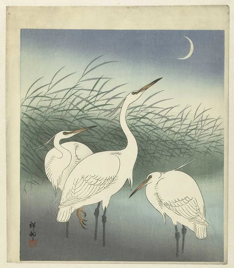 Ohara Koson birds: excelled in capturing the elegance and grace of egrets, known for their slender bodies and long, delicate necks. His paintings often depict these birds in poised stances, reflecting a sense of tranquillity and grace.