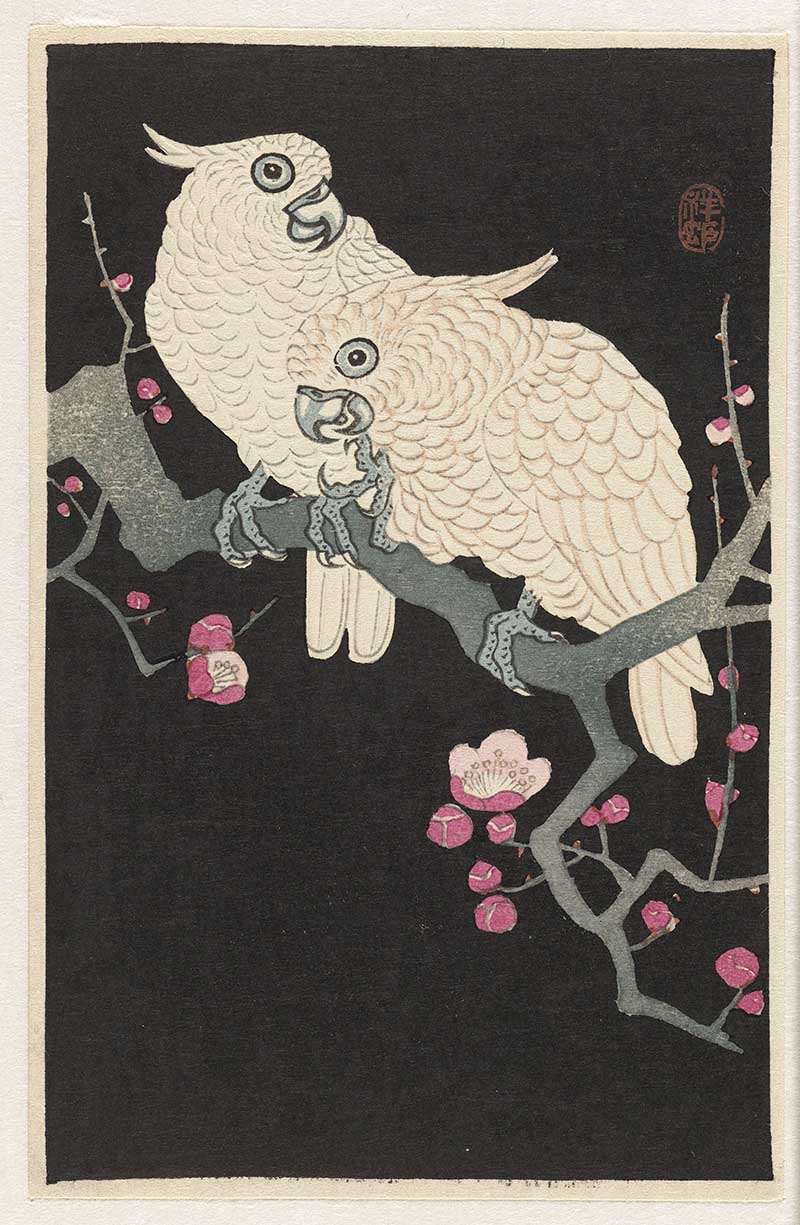 The original Ohara Koson bird print I stumbled across, two cockatoos on branch with plum blossom.