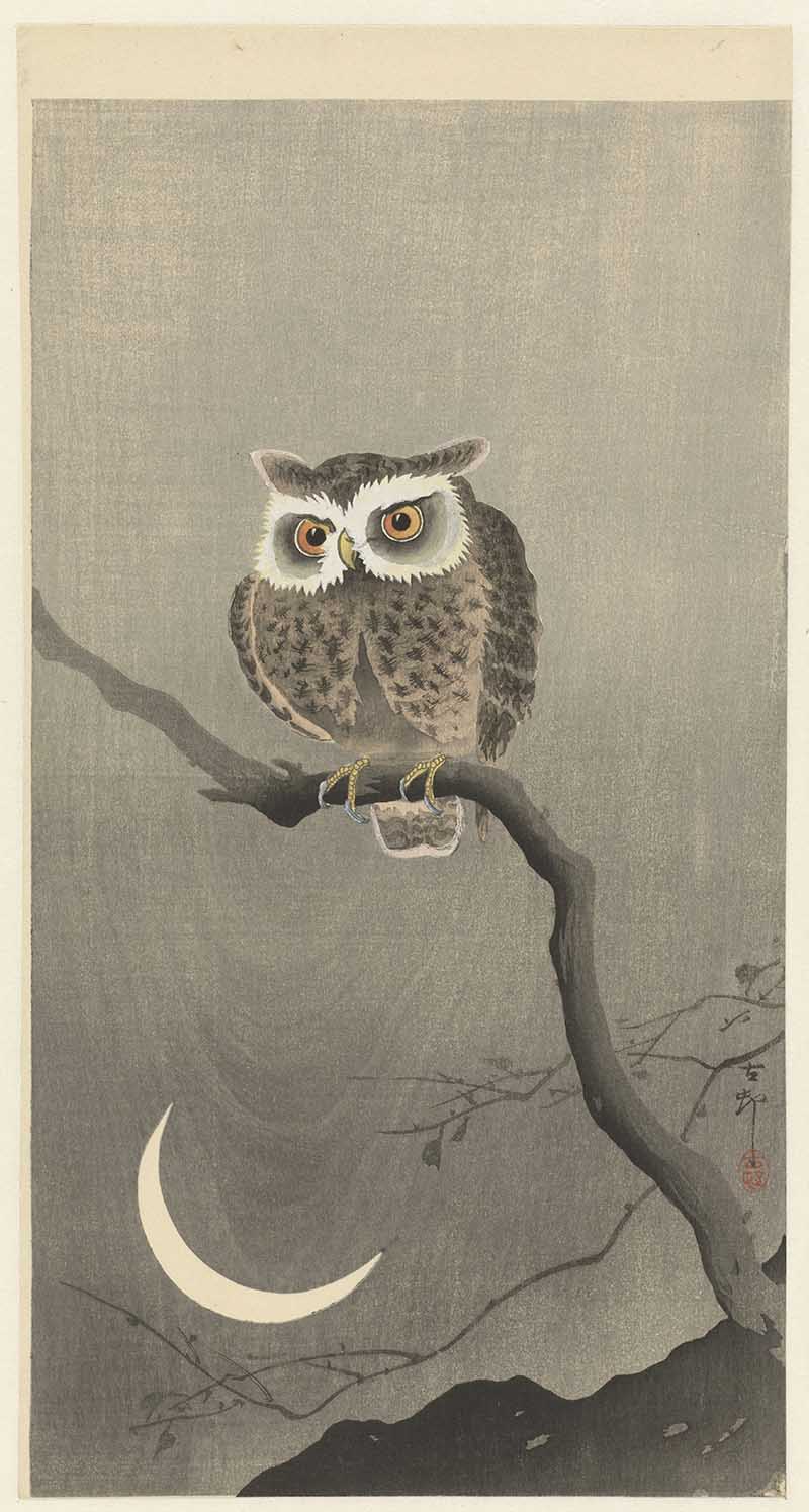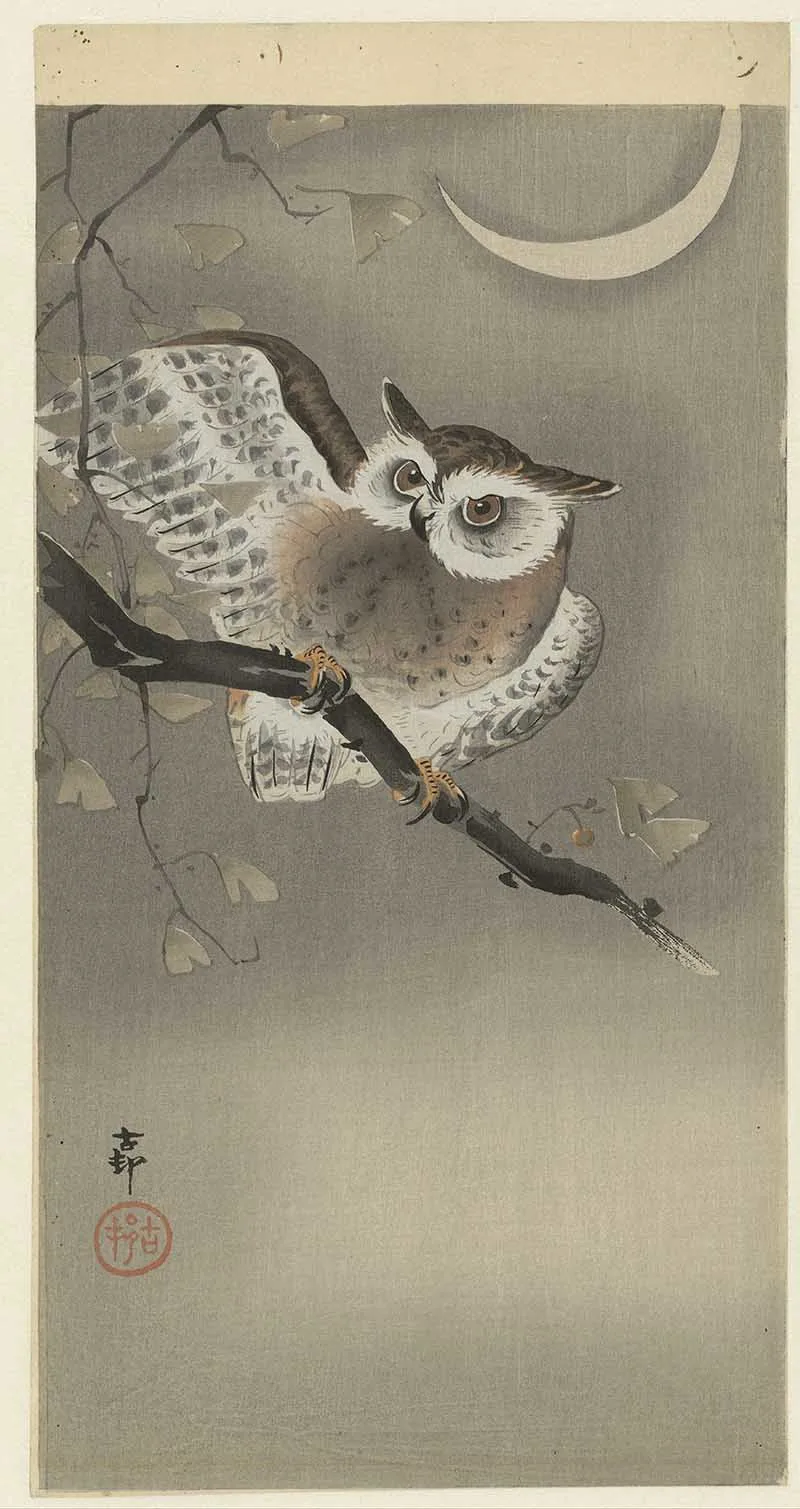 Koson’s owl paintings often carry an air of mystery. Owls are usually associated with wisdom and nighttime in many cultures. Koson captures this essence by painting them perched on tree branches or in front of the moon, with their large eyes being the focal point, adding depth and an enigmatic allure to the paintings.