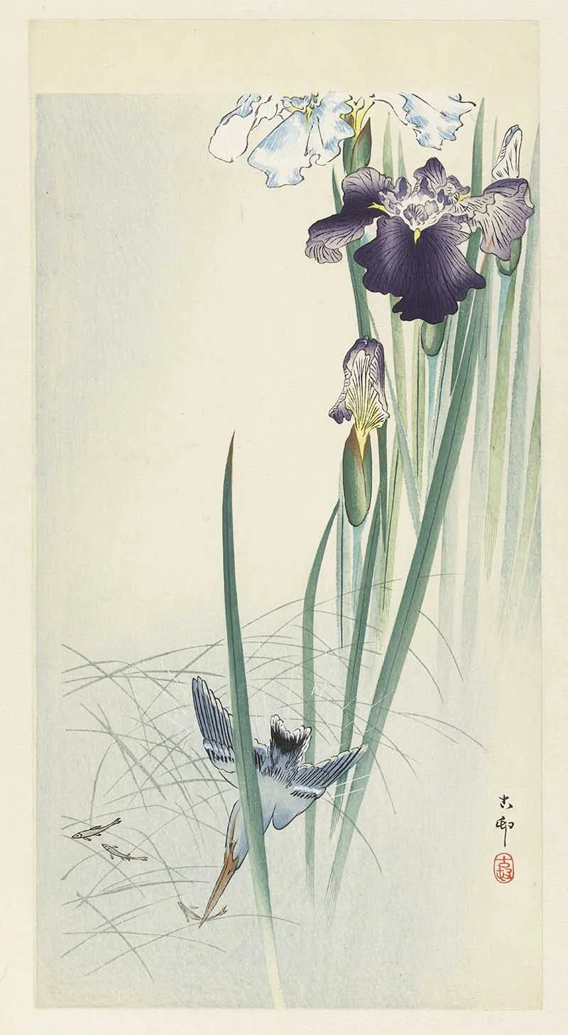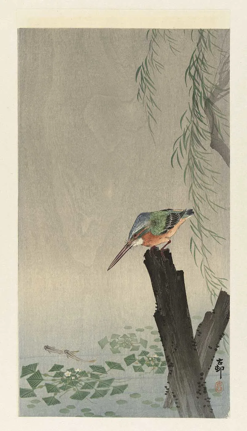 Ohara Koson’s bird paintings often include the Kingfisher, a bird with whom he seemed to have a particular affinity. Kingfishers, known for their striking colours and fishing prowess, are a popular subject in Japanese art, often symbolizing peace and prosperity.