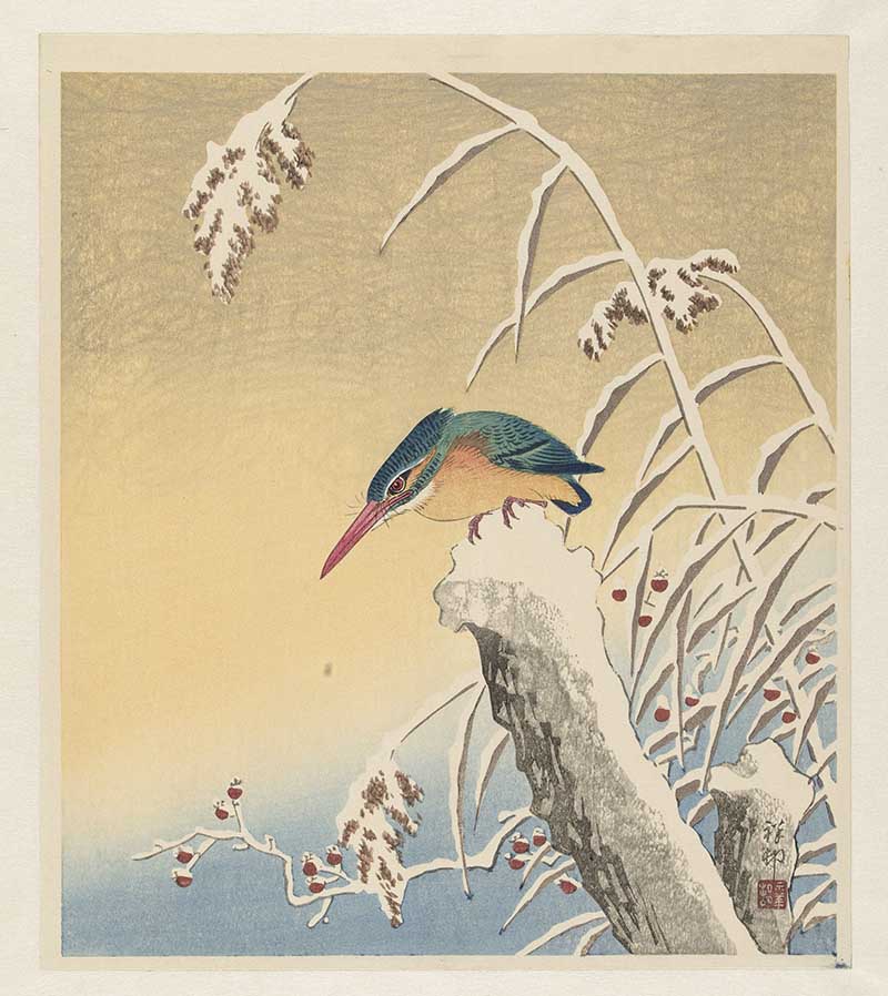 Koson had a way of capturing the grace of kingfishers. Whether they are depicted in flight or perched quietly, his paintings have a sense of movement and elegance that brings the bird’s behaviour to life.