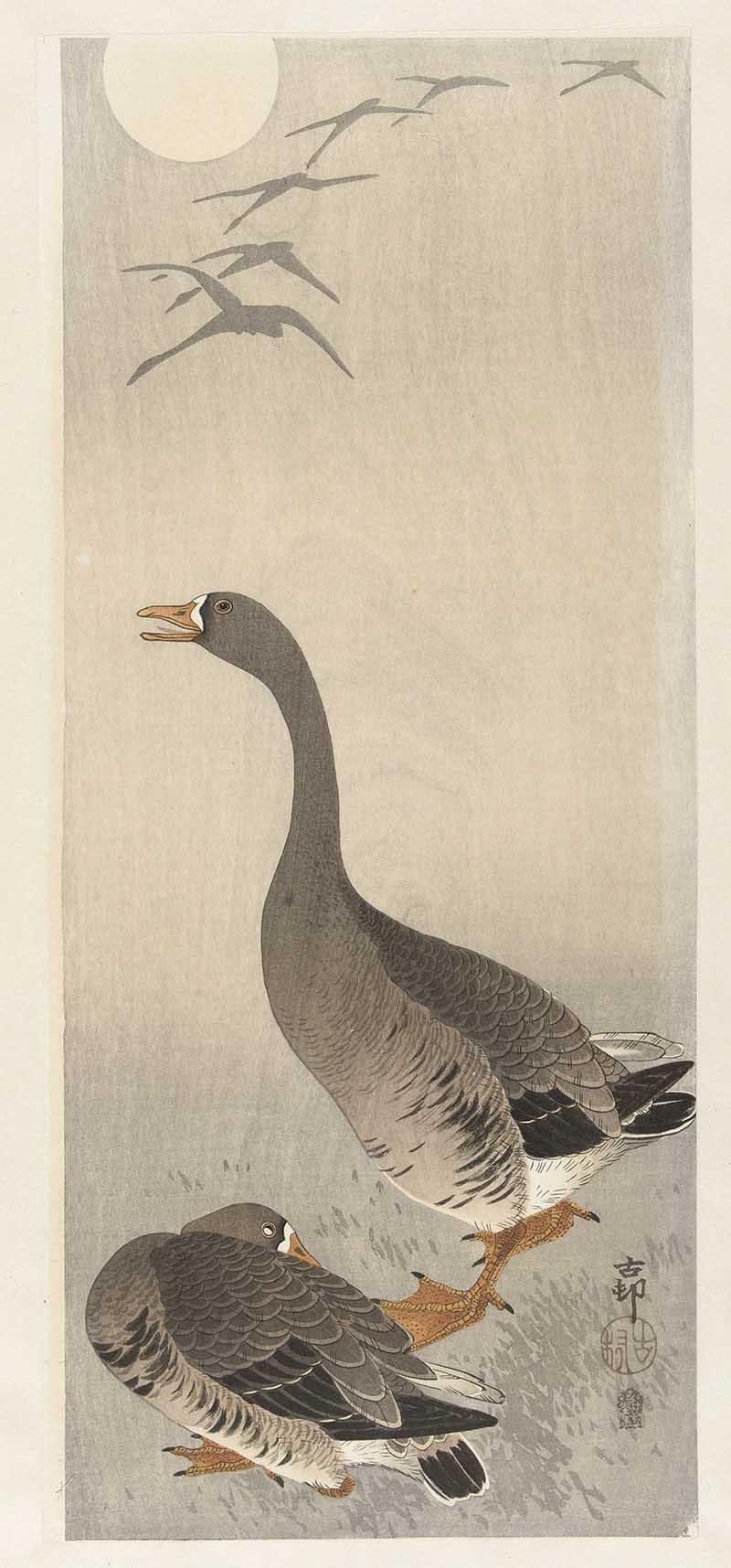 Geese are often seen in groups, and Koson captures this social aspect of the birds. His paintings sometimes feature flocks of geese, and the interactions and formations of the birds within the group are focal points.