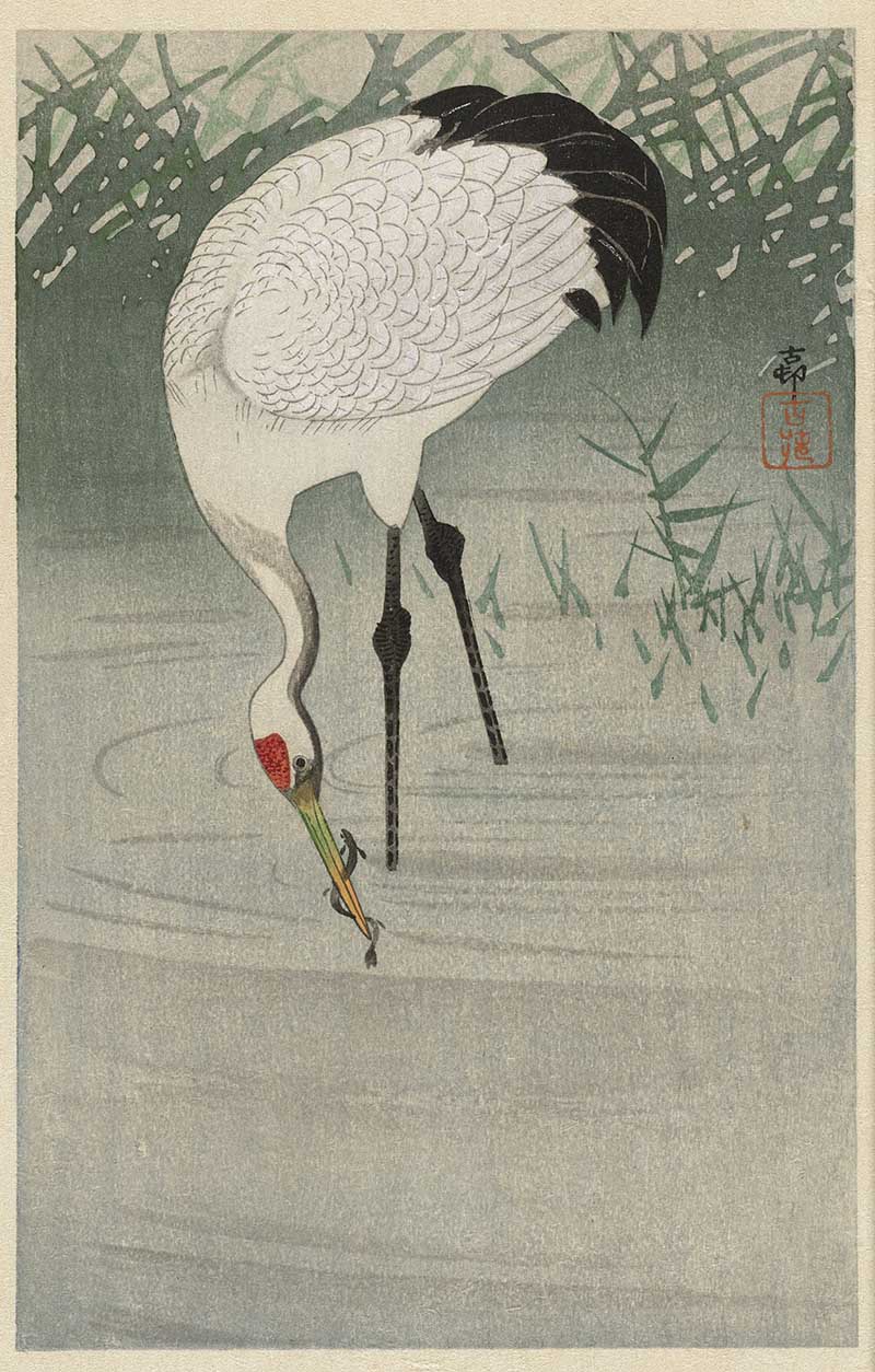 Fishing crane in shallow water. Koson’s crane paintings often use a relatively muted colour palette, with whites, blacks, and greys for the cranes themselves, contrasted against the often more vibrant background colours.