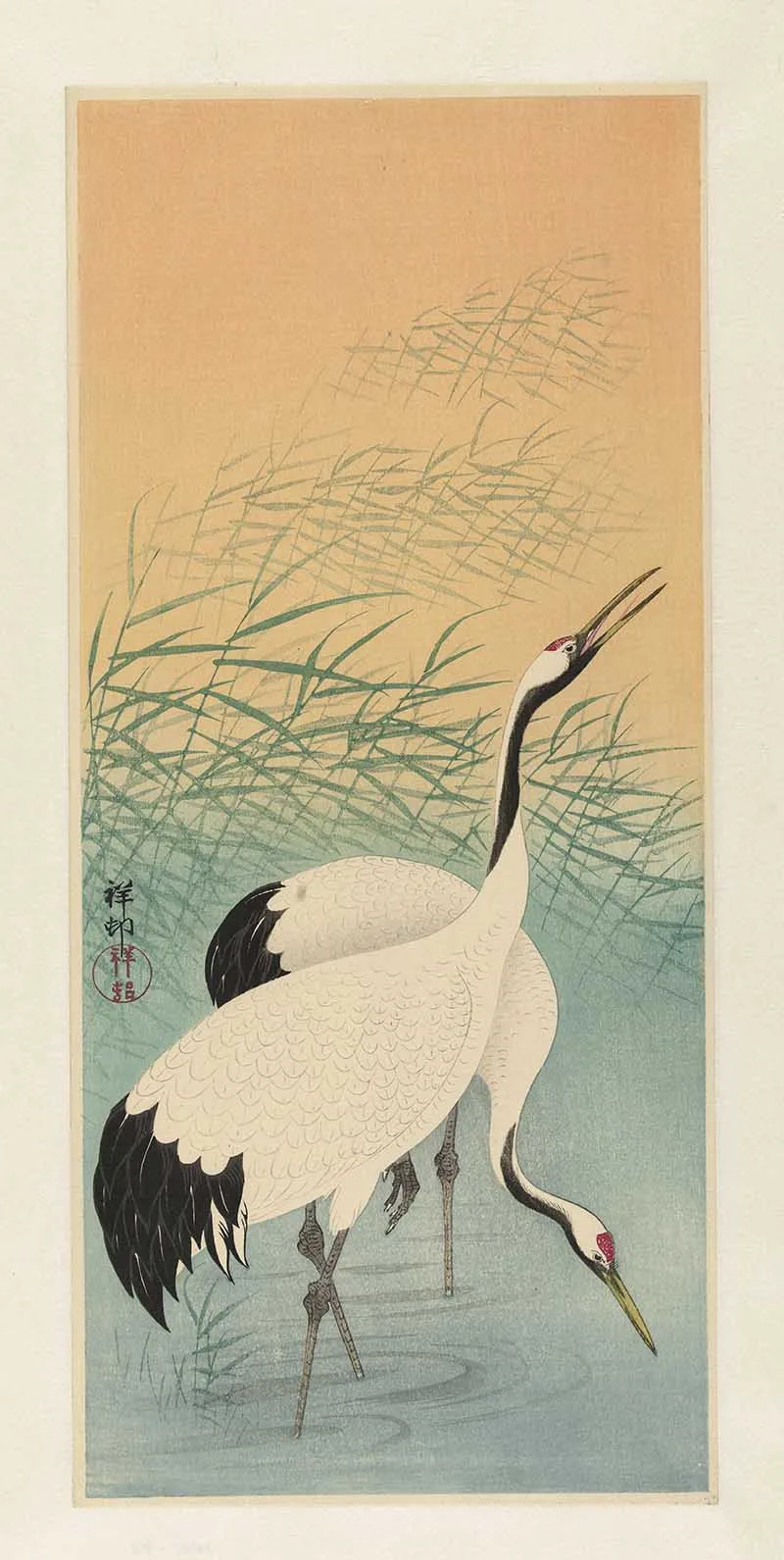 Cranes hold a special place in Japanese culture, symbolizing longevity, good fortune, and happiness, and Koson captured these majestic birds with grace and dignity.