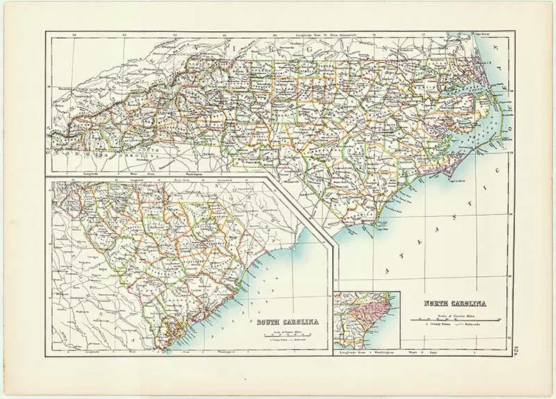 These gorgeous old Maps of the Southern United States come from an original US Atlas circa 1885. Unfortunately, I don’t have details of the original publishers as these maps were purchased loose as individual pages.
