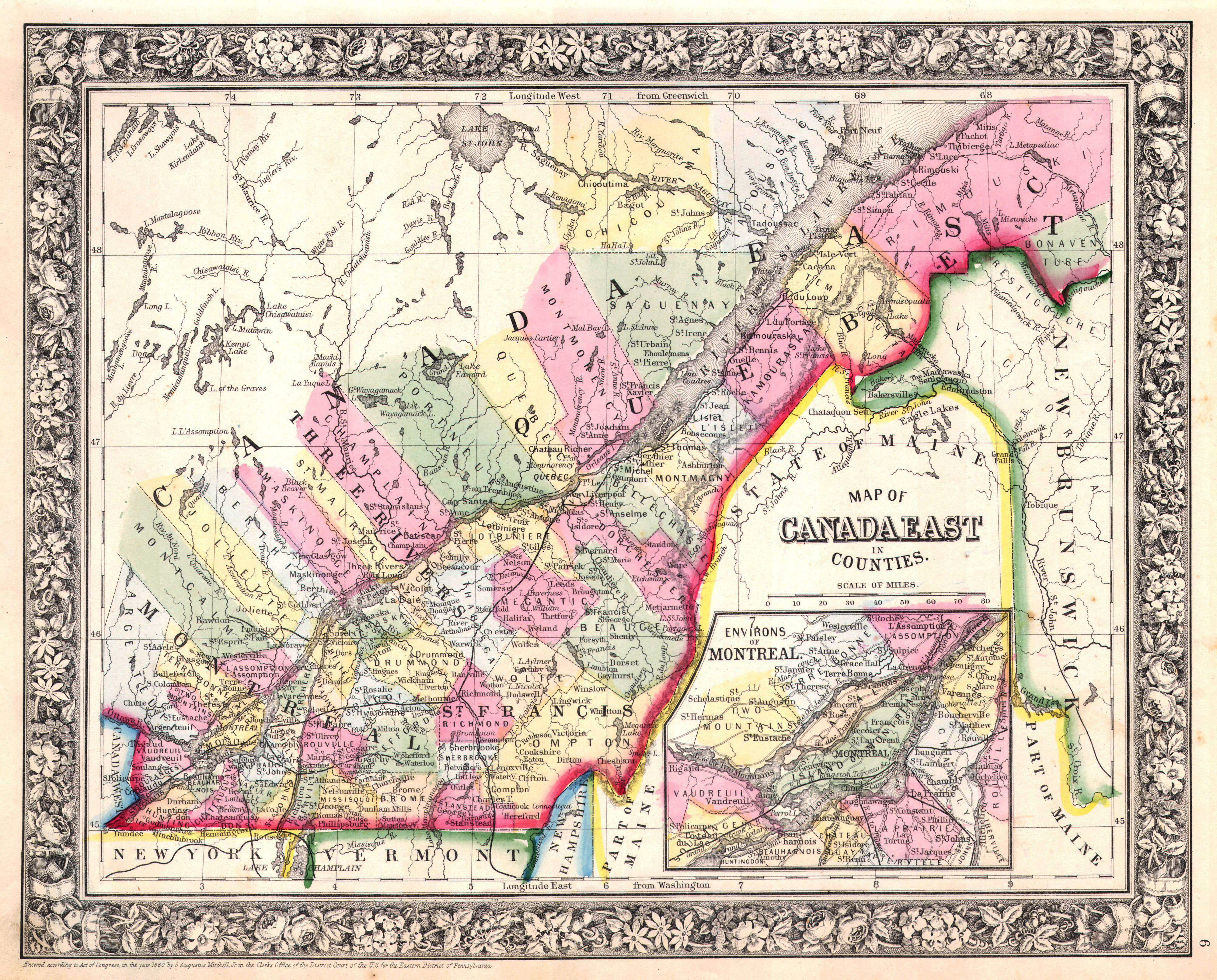 Another wonderful Mitchell map of Canada East, or as it is now known, Quebec. Detailed to the county level with special attention both political and geographic elements. Notes important river systems, railways, canals, and cities. An inset map in the lower right quadrant depicts Montreal and environs.