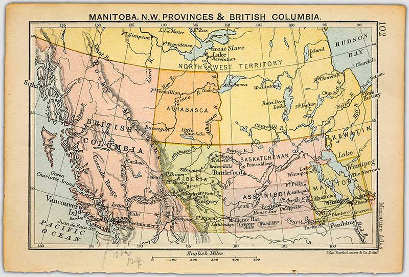 This vintage map of Canada is by the publisher John Bartholomew and shows the provinces of Western Canada.