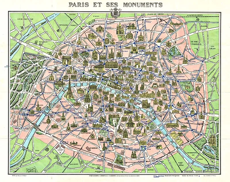 Another map of Parisian monuments from 1926. The map focuses on the historic walled city of Paris and its immediate surroundings.