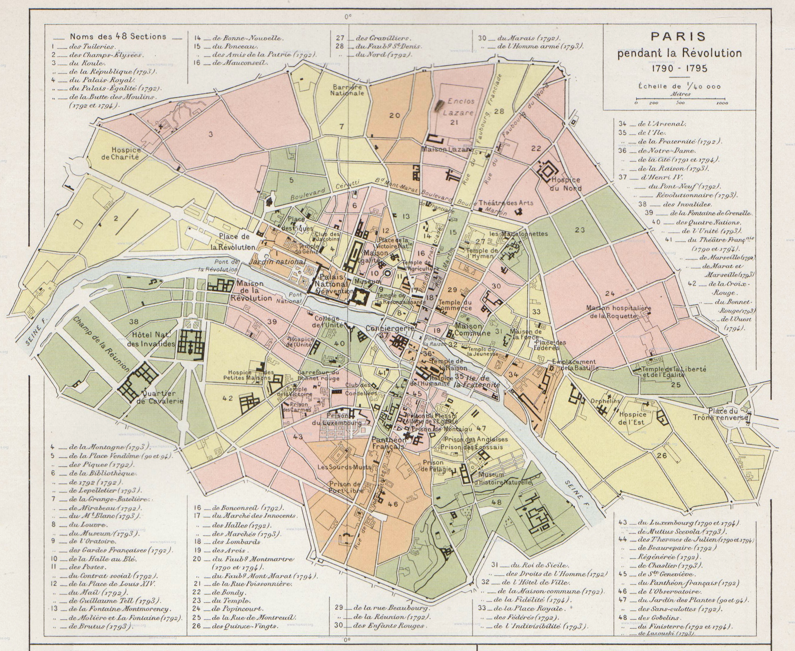 Although this appears to be a map of Paris during the French Revolution (1790-1795), it doesn’t seem to be one. That is because the map was printed in 1912, which explains why some fonts don’t match the era.