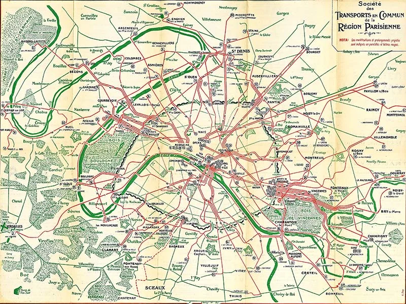 This stunning map of Paris was crafted by Robelin in Montrouge and vividly lithographed in colour. This tourist map is adorned with numerous vignettes depicting iconic landmarks of Paris, including the Eiffel Tower, the Arc de Triomphe, and Notre Dame. It extends beyond the city limits and the Thiers wall to illustrate neighbouring towns, represented by vignettes. Additionally, the map details the Metropolitan network. Although undated, it can be accurately dated to 1911, given the inclusion of specific lines and stations.