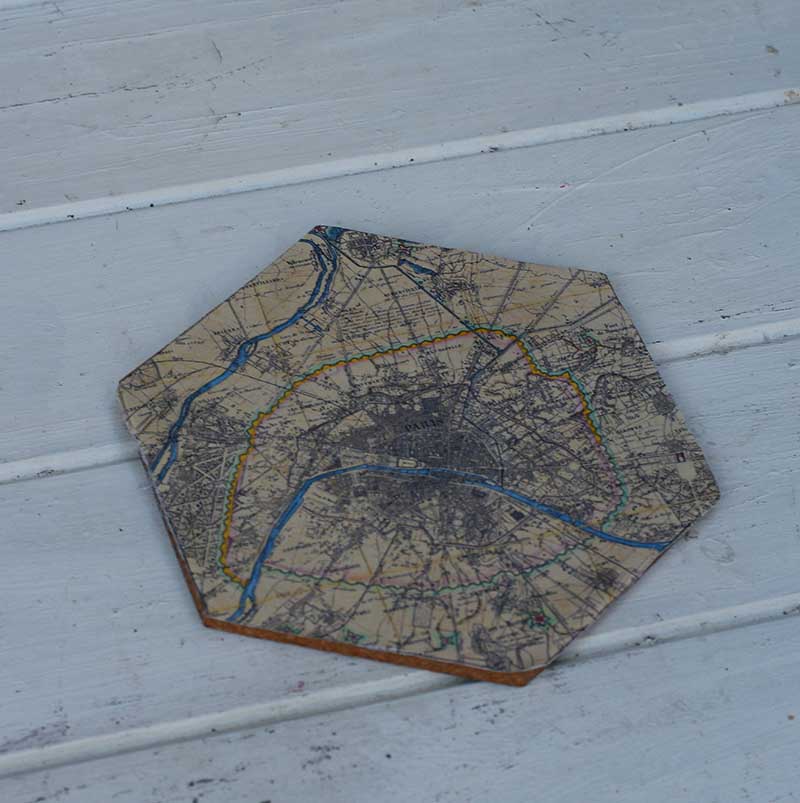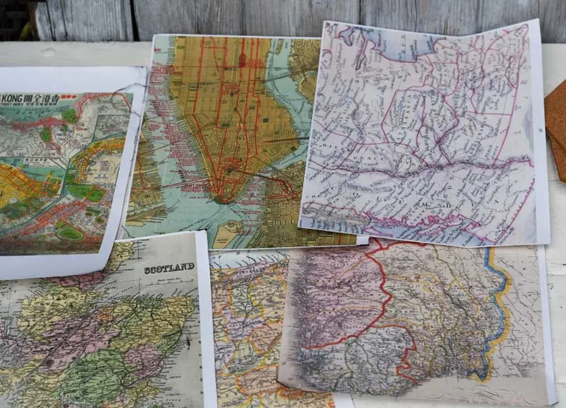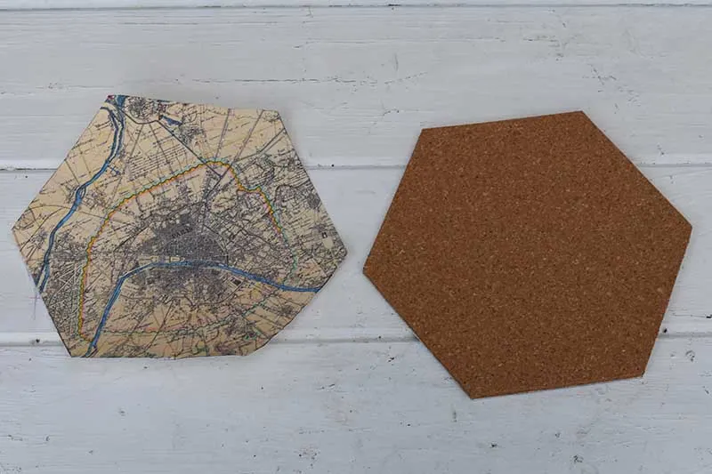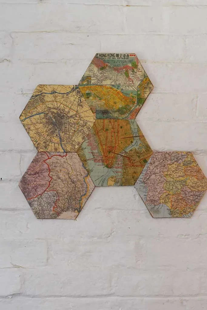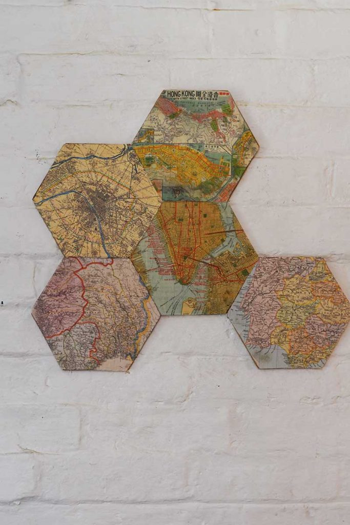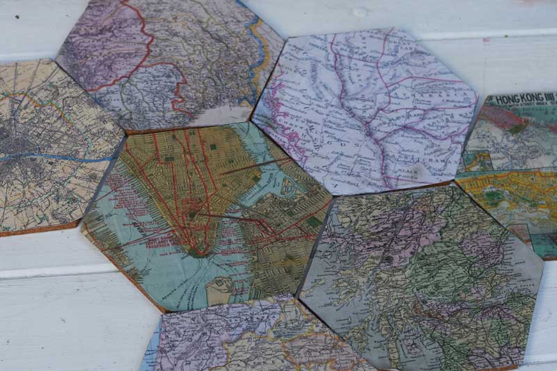 8. Carry on until all the cork hexagons are covered in maps. Then play around with arranging the hexagons into different shapes.