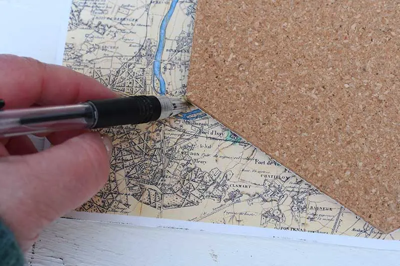 4. Next, place a cork board hexagon over the bit of the map you want to use. Then draw around the hexagon with a pen.