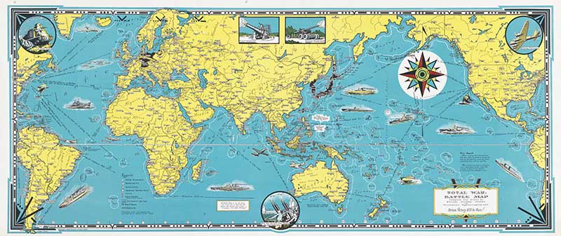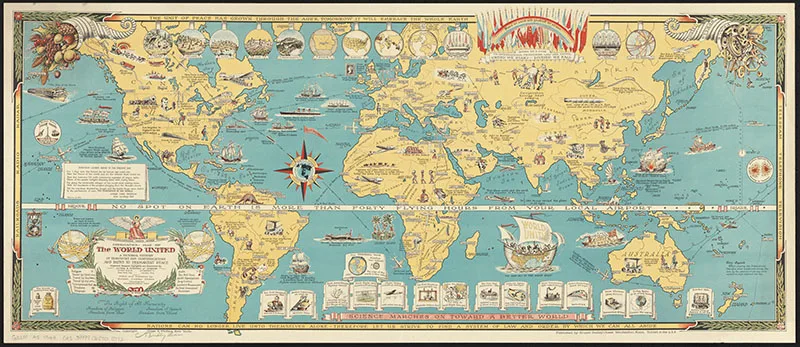 Mercator map of the world united – a pictorial history of transport and communications and paths to permanent peace.” Published in 1944 and over a meter long.