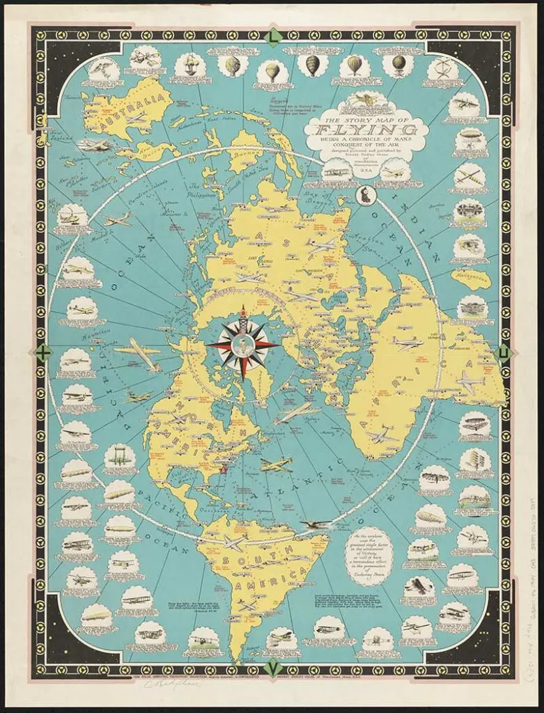The story map of flying : Being a chronicle of man’s conquest of the air.” Published in 1942, the map is filled with drawings and images of flying machines with descriptive text.