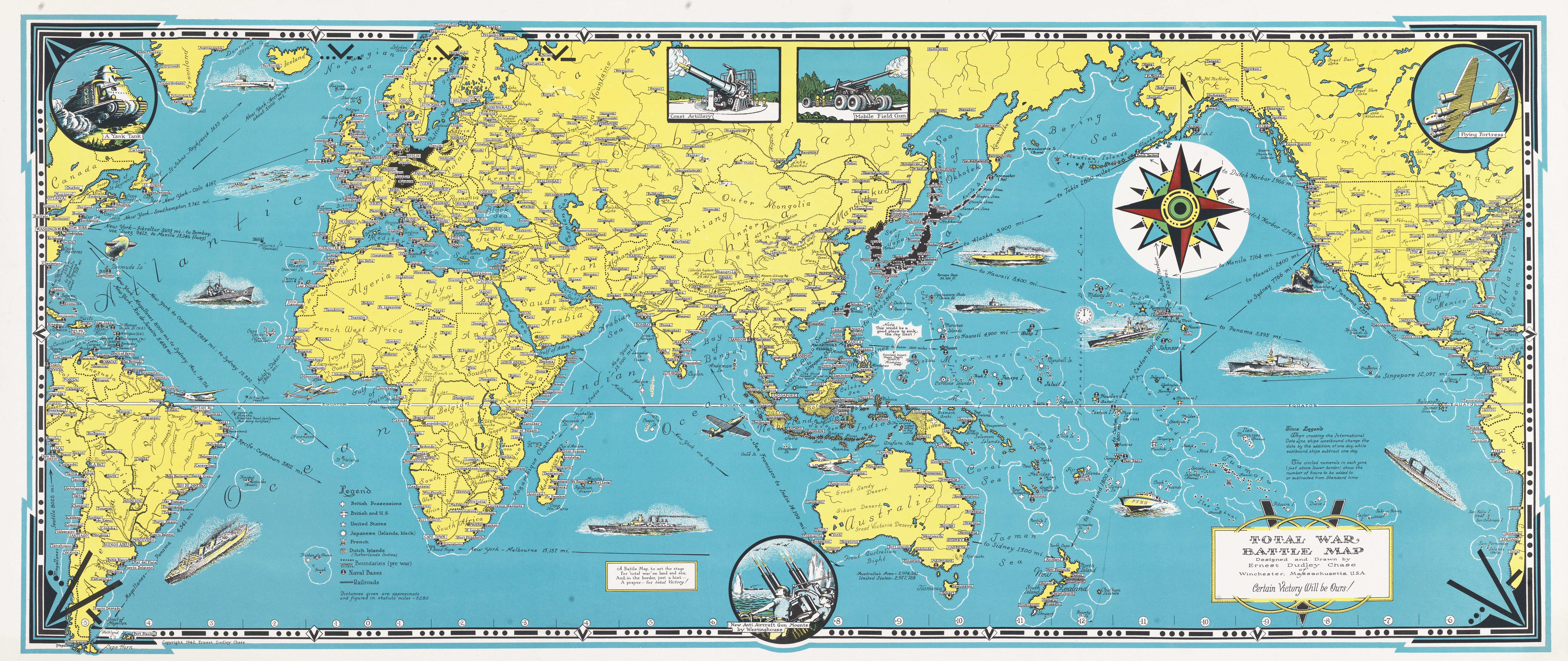 Published in 1942 World War II battle map with all countries and major cities throughout the world. Legend and symbols show British possessions, combined British & U.S. possessions, and those of the French, Japanese and Dutch islands.