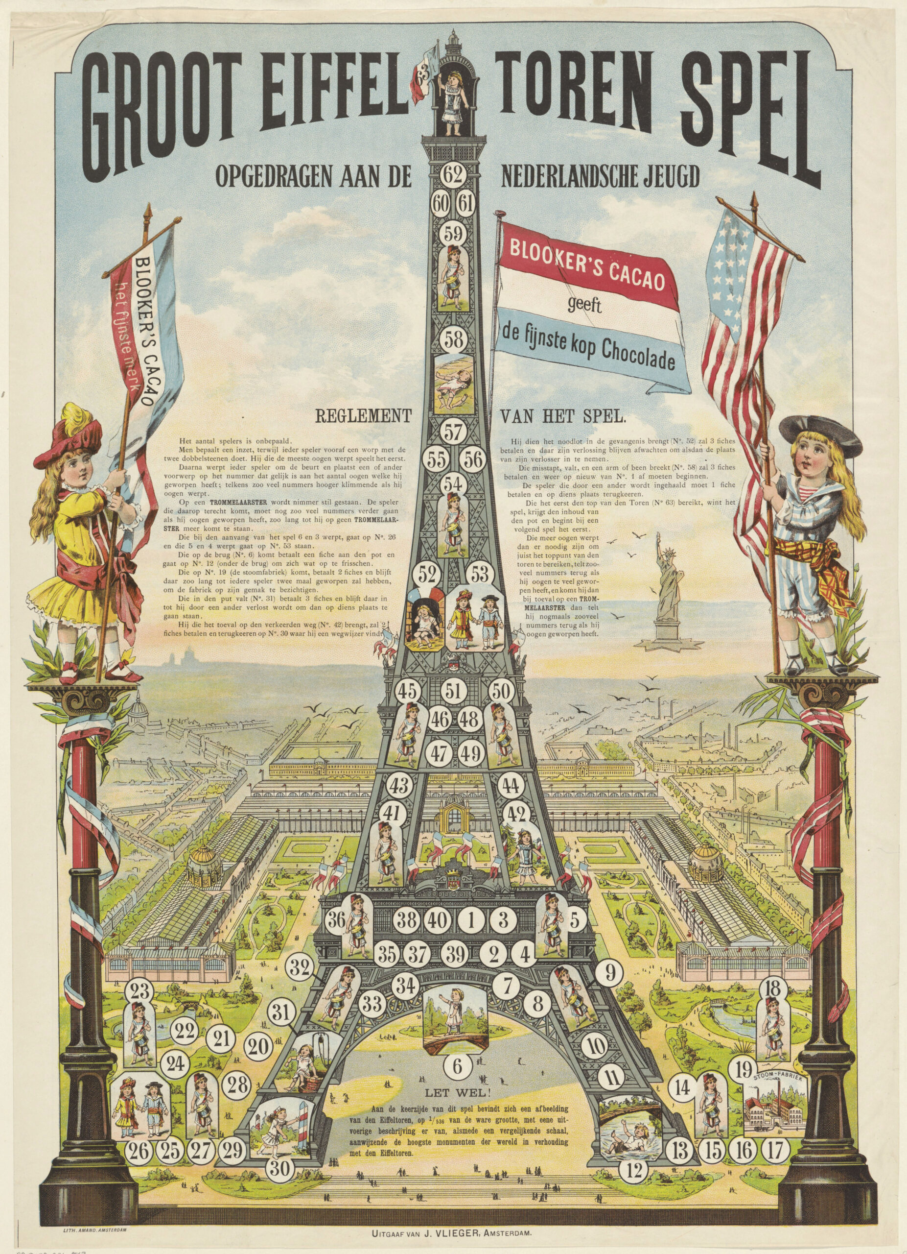 Illustrated board game with circles numbered 1 to 63, walking over the Eiffel Tower. Goose board-like advertising game, on the occasion of the world exhibition in Paris in 1889, for Bokler’s cocoa.