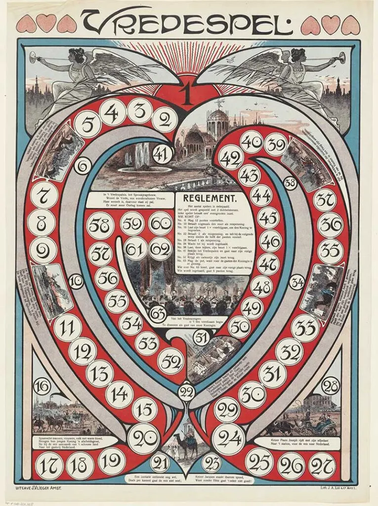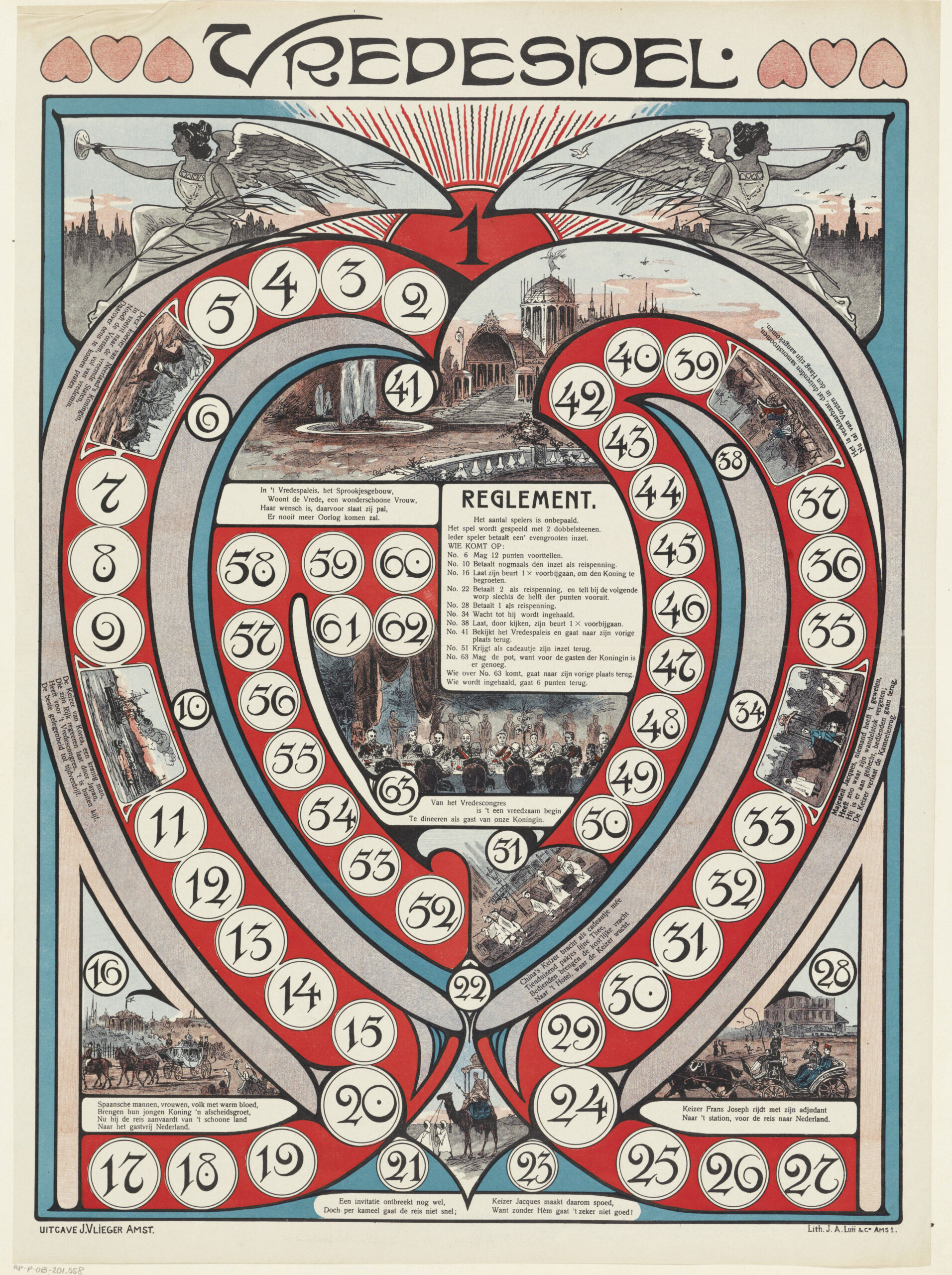 Dutch board game (1907) on the occasion of the second Peace Conference in The Hague and the start of the construction of the Peace Palace. Heart-shaped goose board-like game with squares numbered from 1 to 63. In the midfield, the rules of the game are in letterpress.