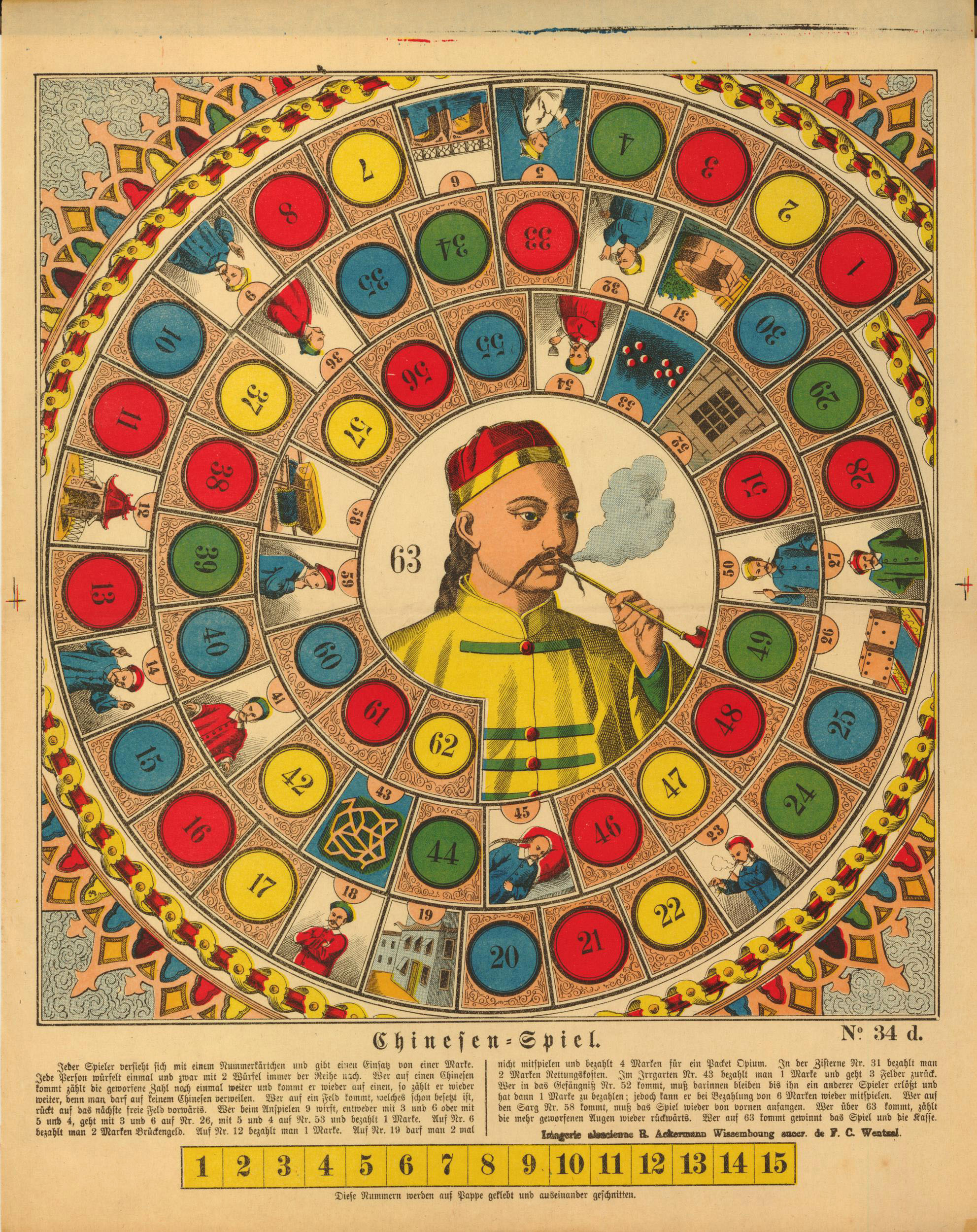 This is a picture of a circular game board from the British Library collection. There are sixty-three fields for cutting out: the head and shoulders of a Chinese man at the centre, directed to the right, smoking a pipe, surrounded by numbered fields, some with Chinese figures and buildings; below, numbers between 1 and 15 for cutting out; No.34 d from a series.