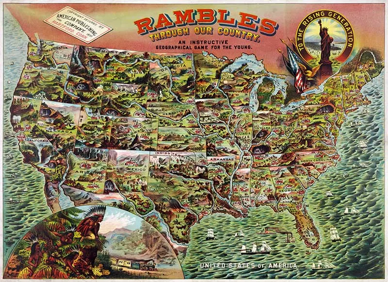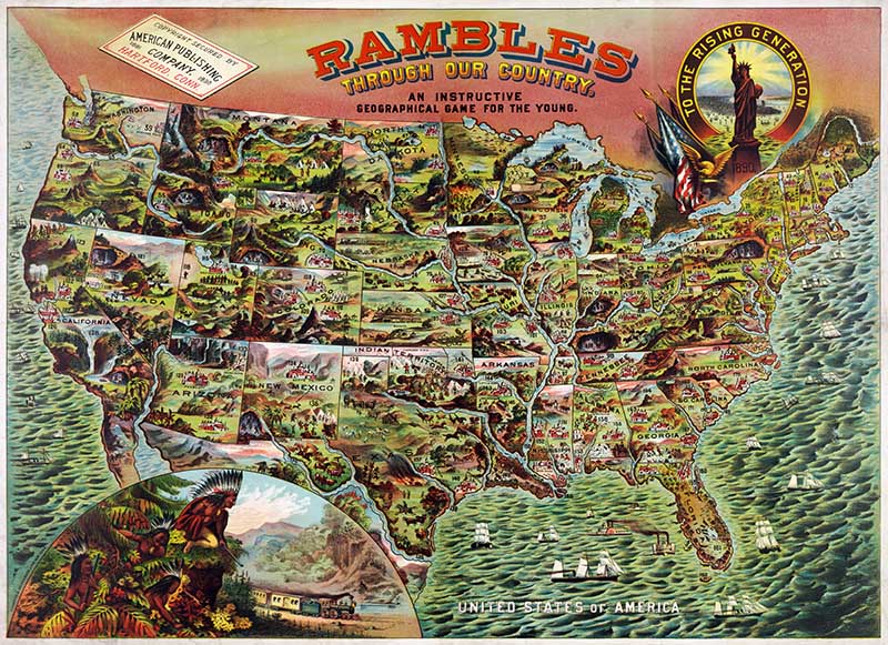 The game rambles through the USA. It is an instructive geographical game for the young. The board game shows a map of the United States of America as it appeared in 1890.