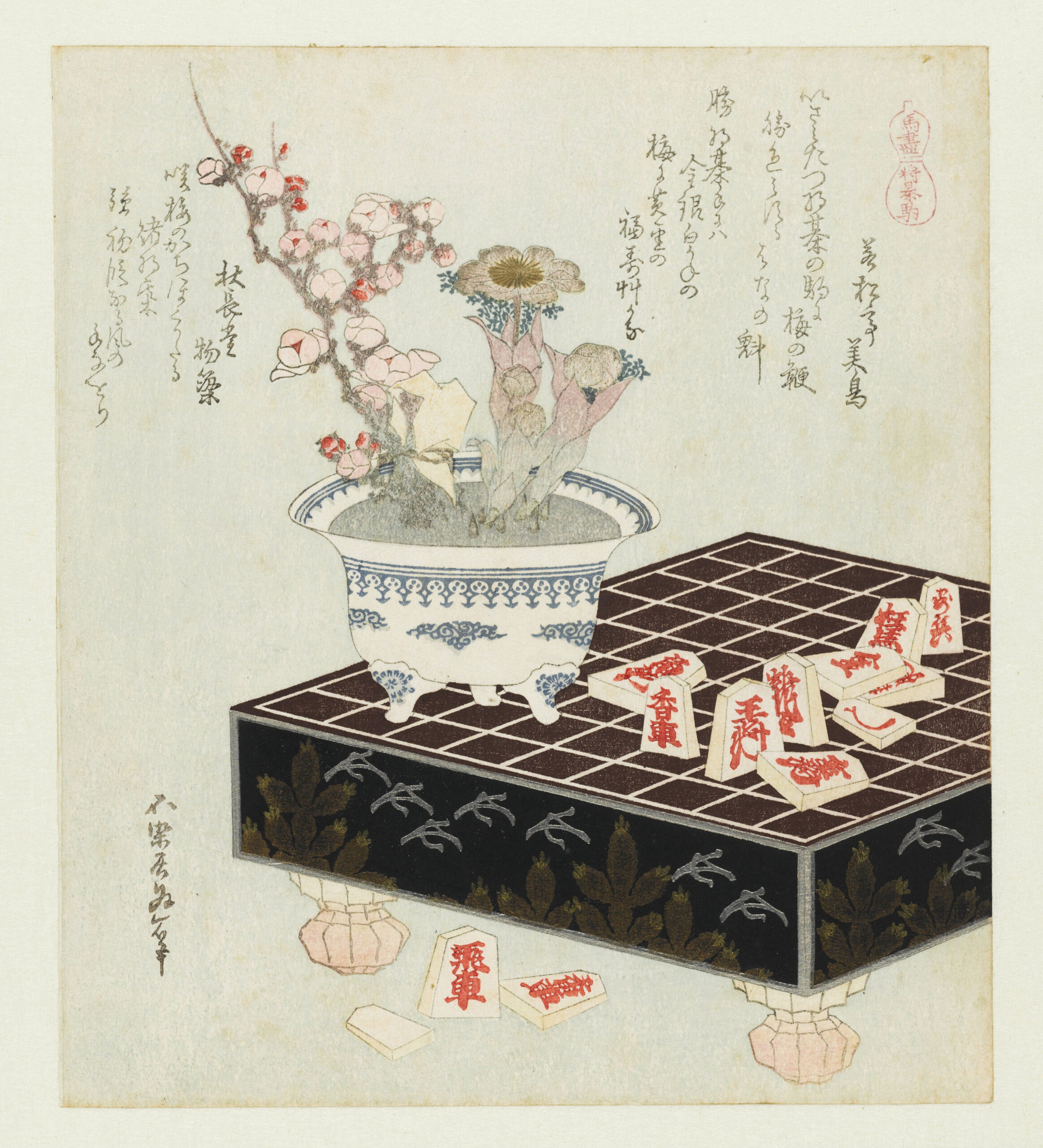 A Japanese woodcut depicts a pot filled with spring anemones and dwarf plum blossoms on a game board from the Japanese chess variant, shôgi. The stones in this game are also called ‘horses’; hence, this design is part of a print series published for the new year of the Horse in 1822, accompanied by two poems.