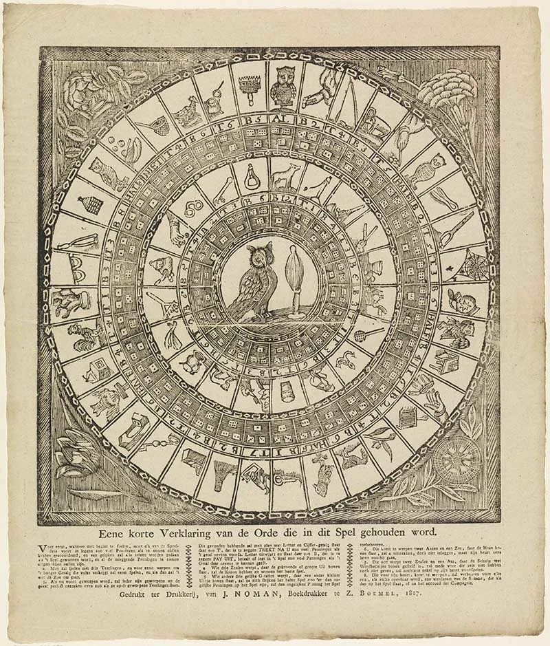 This is a picture of a Dutch Board game, the Owl Game. A circular board game with compartments containing objects, animals and dice. In the middle is an owl with a mirror. Below the game board, the game’s rules are in three columns.