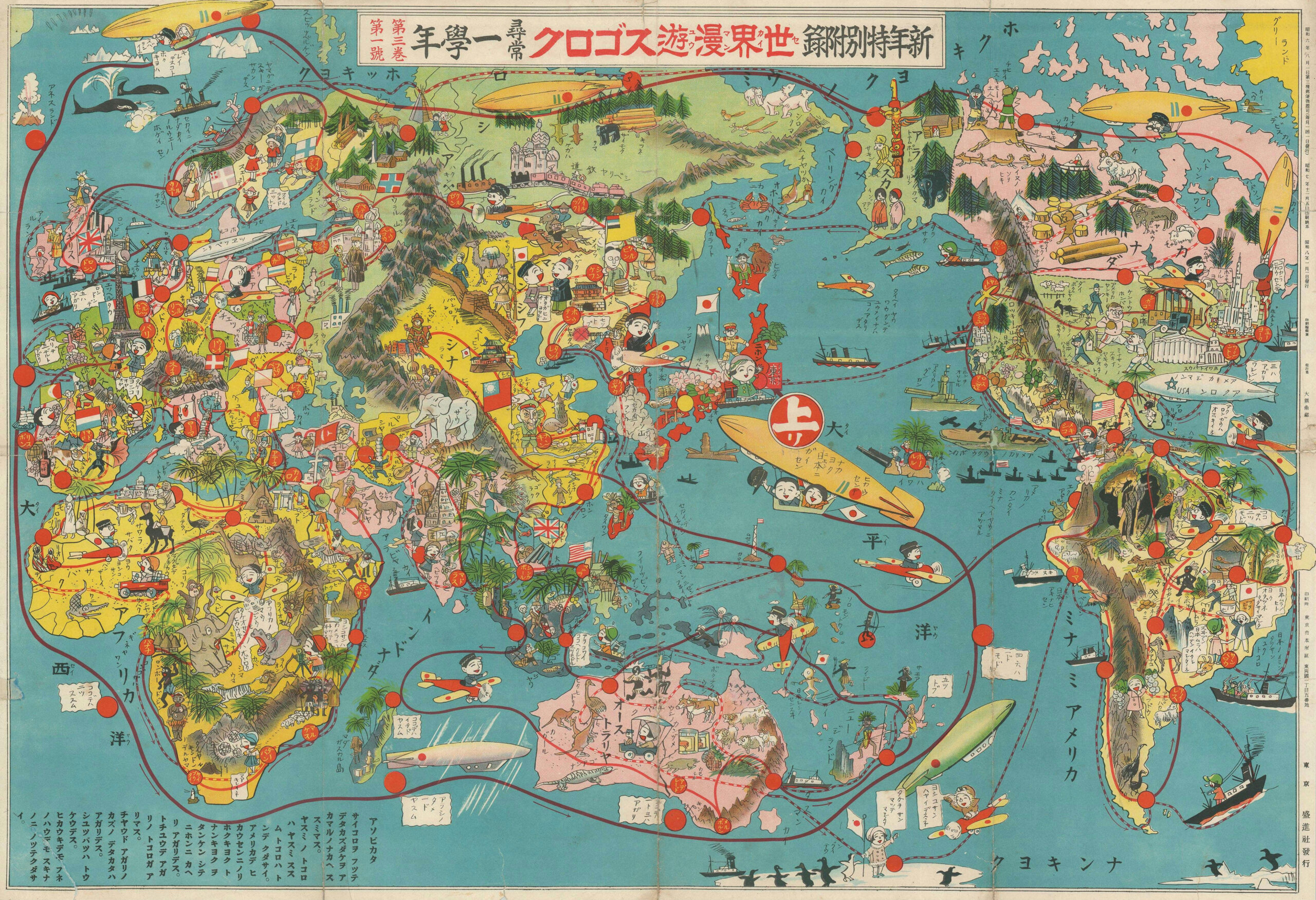 This game board has a wonderfully illustrated pictorial map of the world. It reminds me of some of the Chase Pictorial World Maps.
