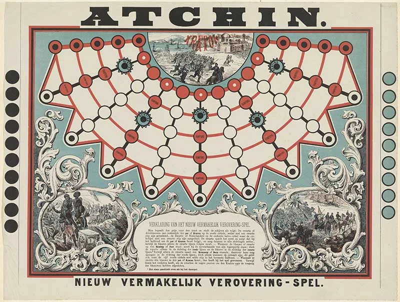 A vintage Dutch board game called Atchin (1974). Atchin is the old name of present-day Aceh in North Sumatra. The game’s object is to capture the Kraton (Sultan’s Palace). Three representations of Dutch soldiers and Indonesians are right under the rules of the game in letterpress.