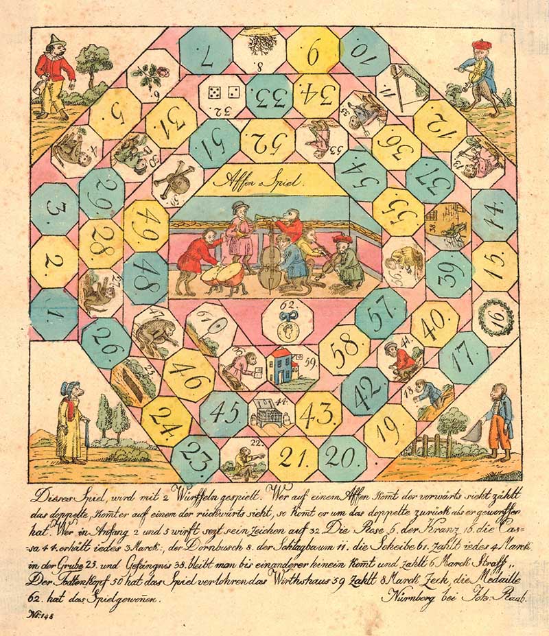 A game board in an octagonal shape with compartments numbered from 1 to 63 arranged in a spiral, some bearing pictures of monkeys; in each corner, monkeys wearing clothes; in the centre, six monkeys playing musical instruments; the rules are at the bottom.