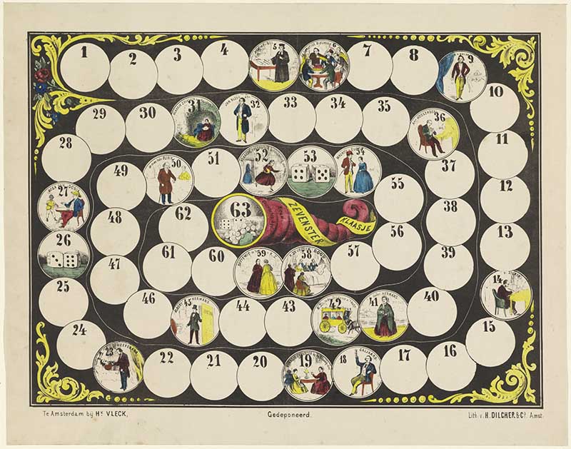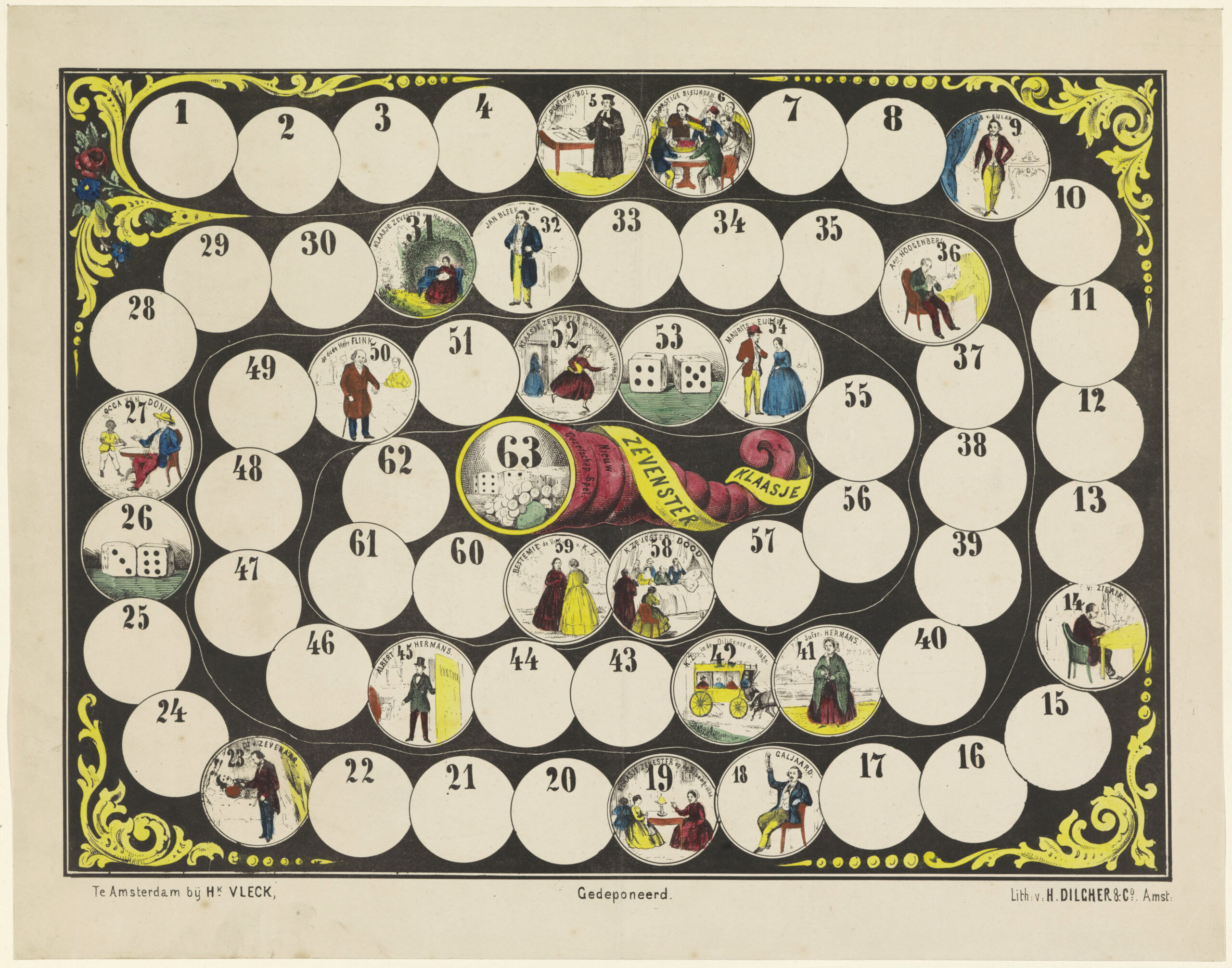 An illustrated board game with a spiral with compartments numbered 1 to 63, with figures from the novel ‘The fate of Klaasje Zewindow’ (1865-1866) by Jacob van Lennep.
