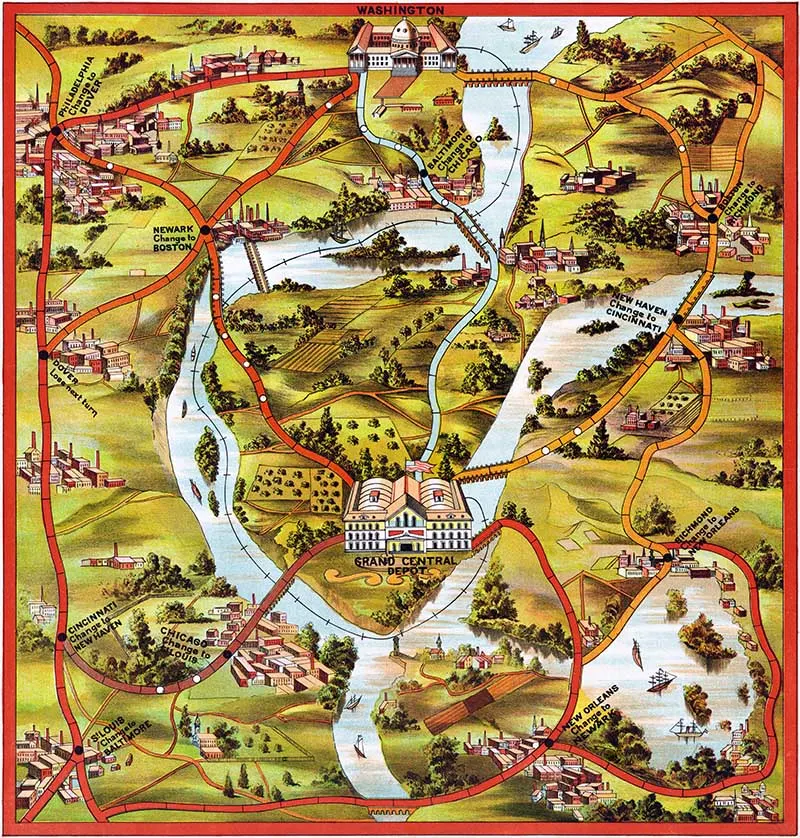 Print showing gameboard for a game “The Road to Washington” 1884 from the Library of Congress. A dice game with “Washington” at the top and “Grand Central Depot” near the bottom with connecting routes through the cities of “Philadelphia”, “Newark”, “Baltimore”, “Boston”, “New Haven”, “Dover” where you “lose next turn”, “Cincinnati”, “Chicago”, “Richmond”, “St. Louis” and “New Orleans.” When a player lands in a city other than Dover, he moves his game piece to a designated city.