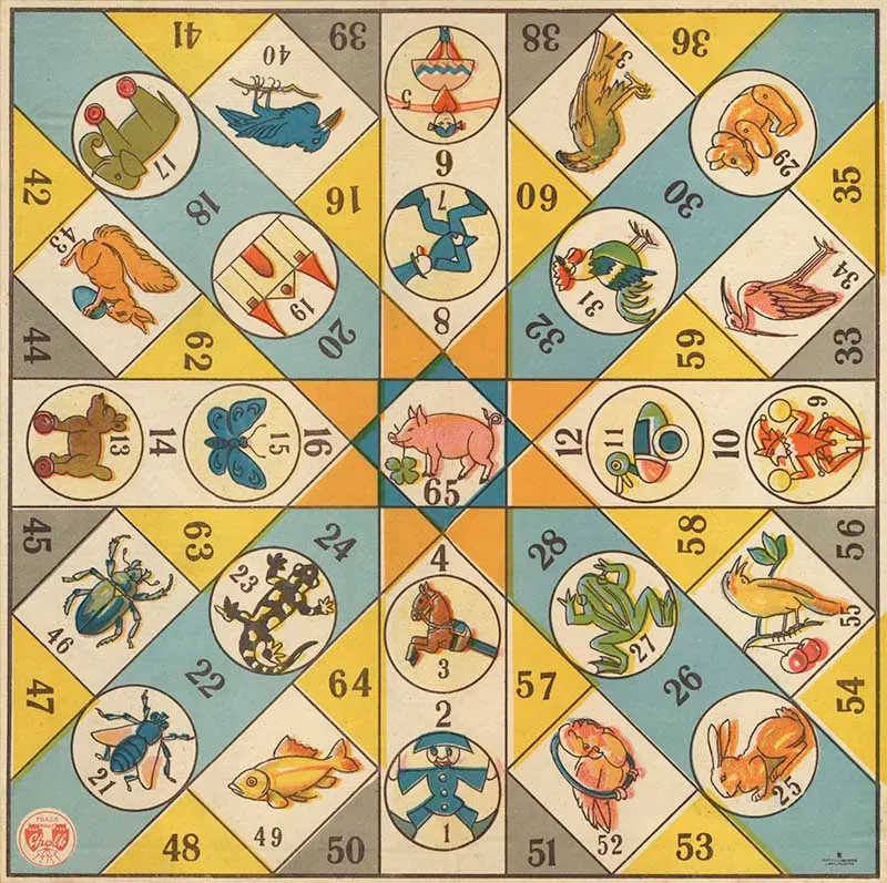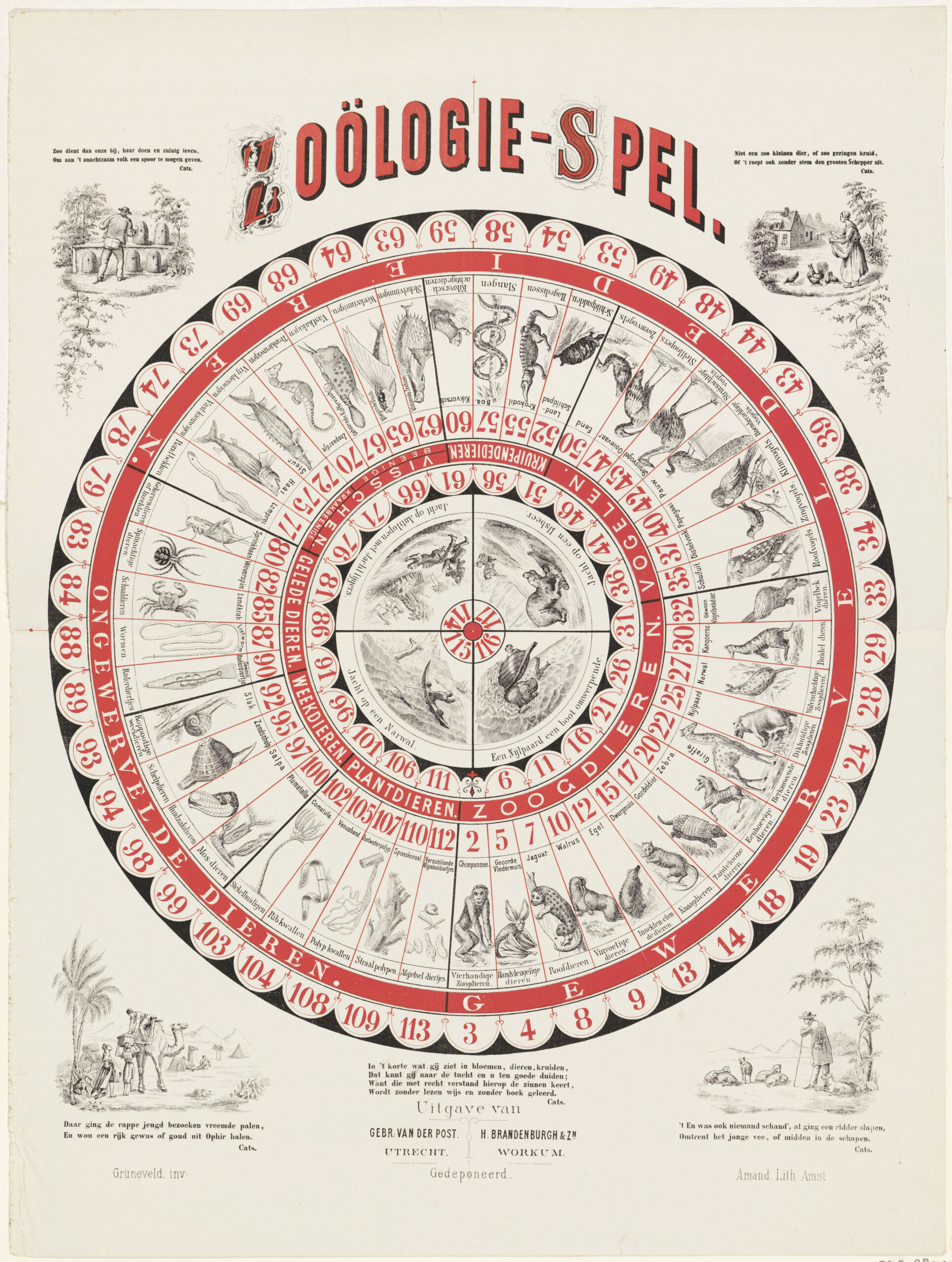 Picture a vintage board game in the form of a circle with numbers numbered from 2 to 117, with vertebrates and invertebrates. There are four hunting scenes in the midfield. In the corners around the circle are images with lines of cats.