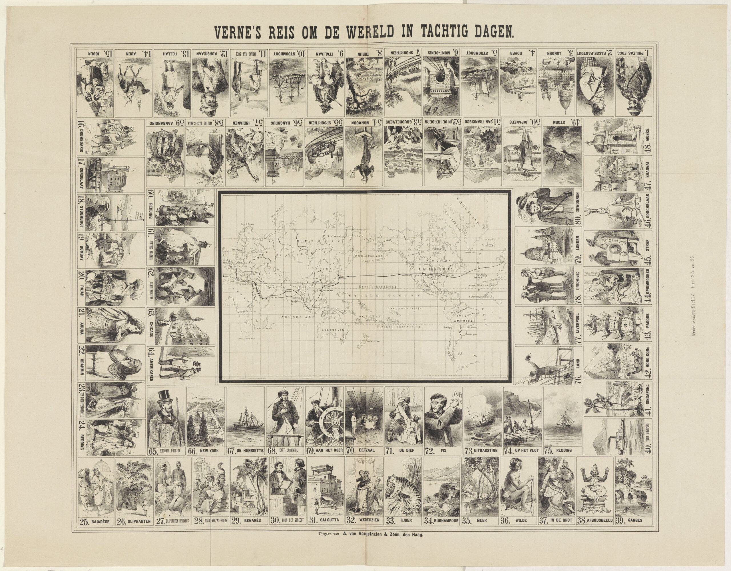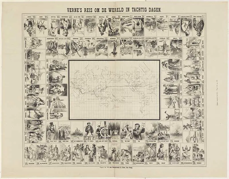 Another Dutch Board game (1876), with 80 numbered boxes with scenes from the story of Jules Verne: Around the World in Eighty Days. In the centre is a representation of a world map with the travel route.