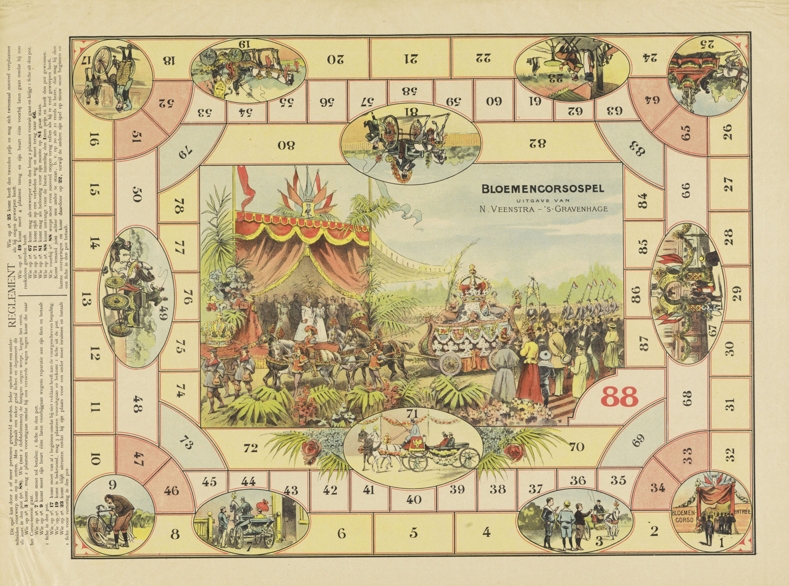 A Dutch rectangular board game with 88 numbered squares. In the centre, a large image of a flower parade during the inauguration celebrations following the inauguration of Queen Wilhelmina in The Hague. Pictured is the first prize-winning chariot. Wilhelmina and Emma watch from a stage then. On the left, the game’s rules are in letterpress in two columns.