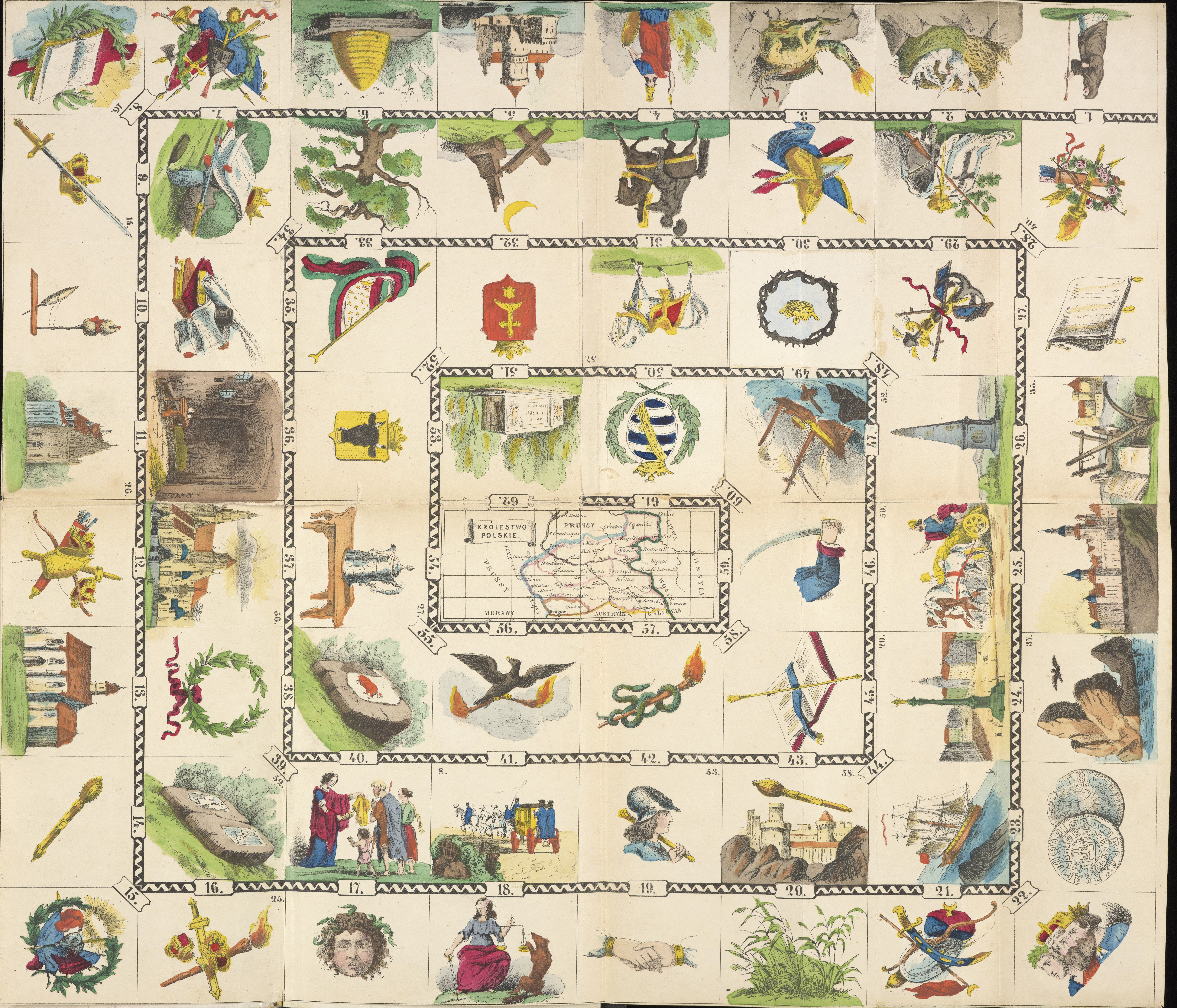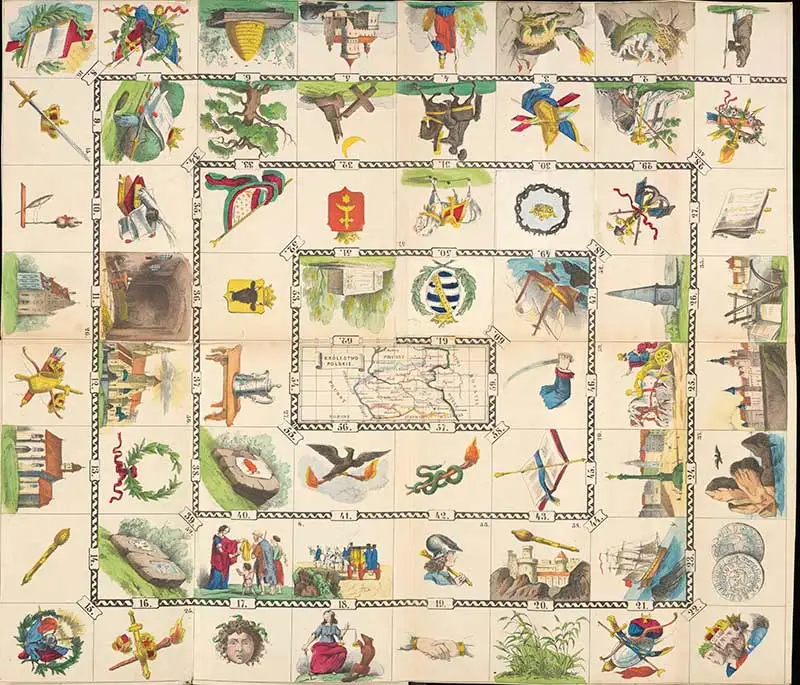 Assarmot was Poland’s first educational board game, created around 1830 by Klementyna Hoffmanowa. Based on the classic Game of the Goose, players rolled dice and moved along a spiral board featuring key figures and events from Polish history.