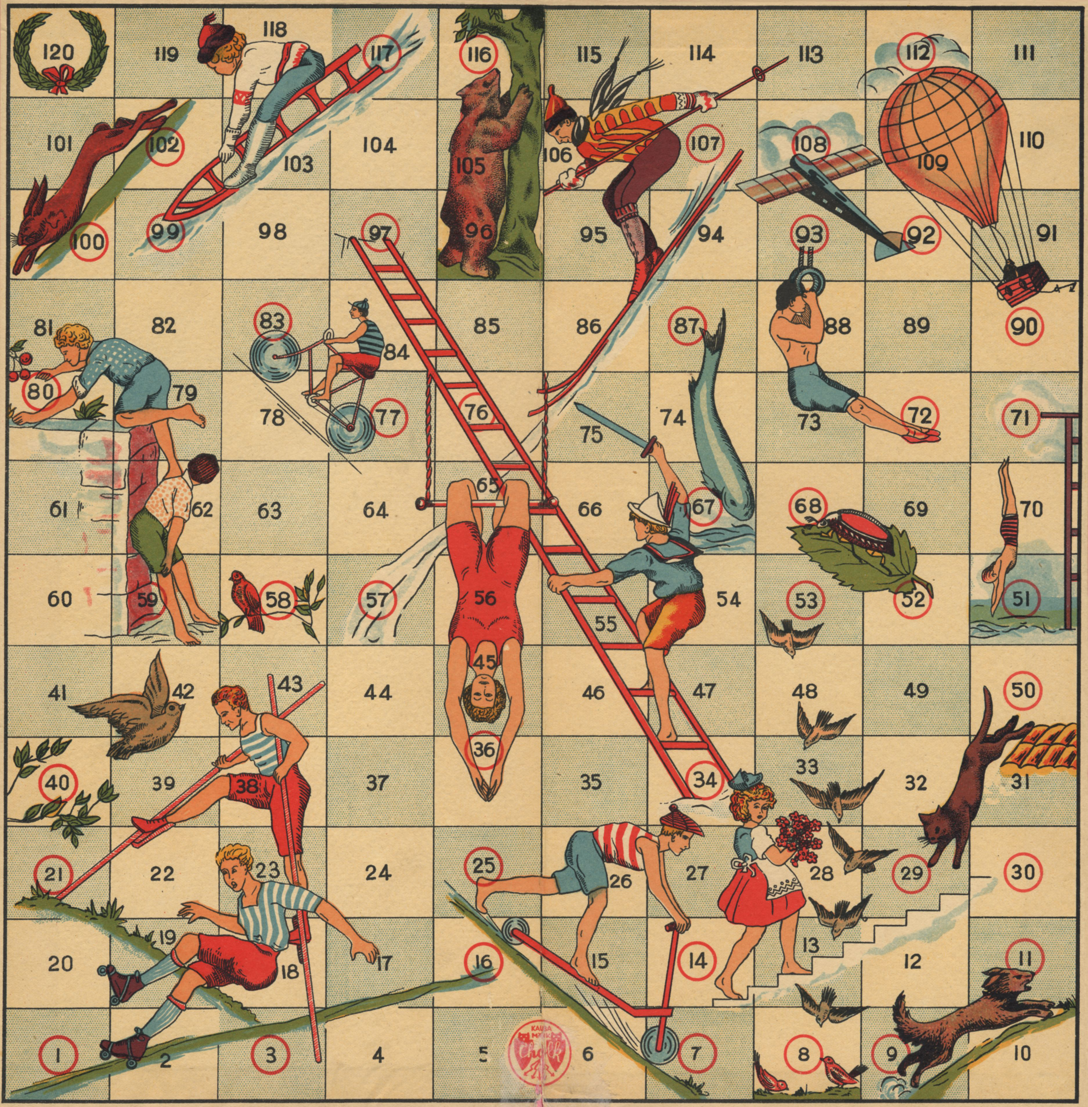 A picture of a game board with red, gold, and blue spaces, numbered between 1 and 122; on the board are illustrations that are numbered and correspond to the blue “starred” spaces, which are action spots. The player landing on one follows the instructions given with the corresponding illustration, and moves accordingly.