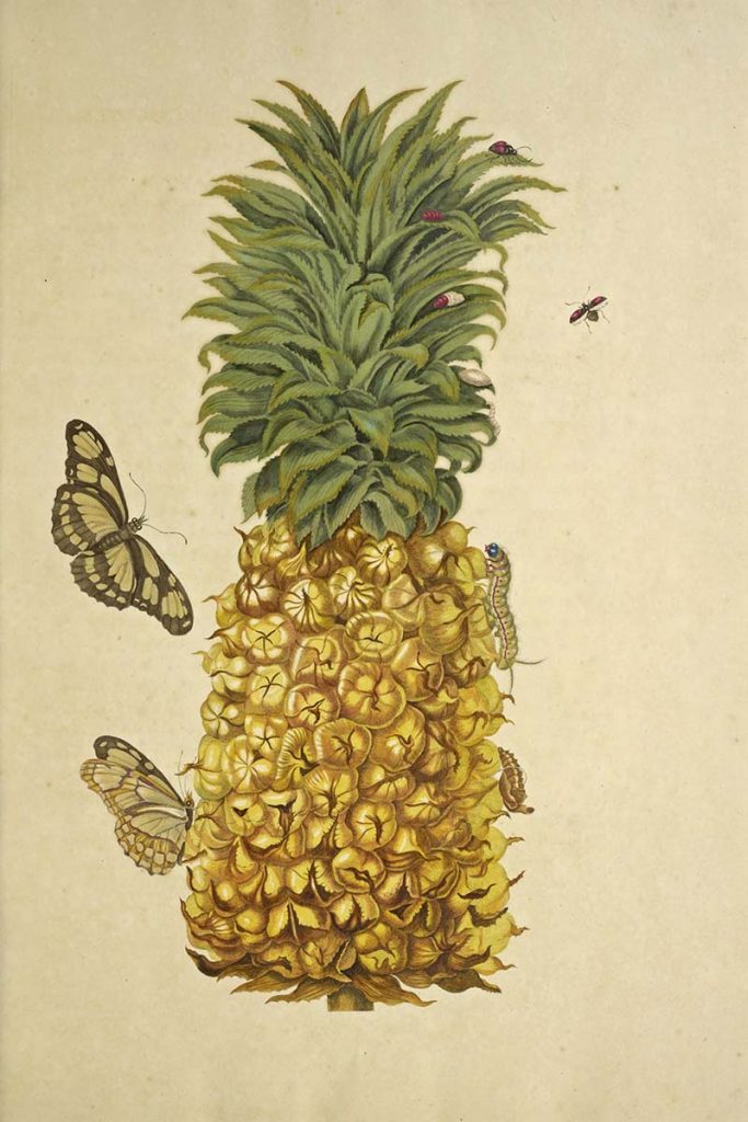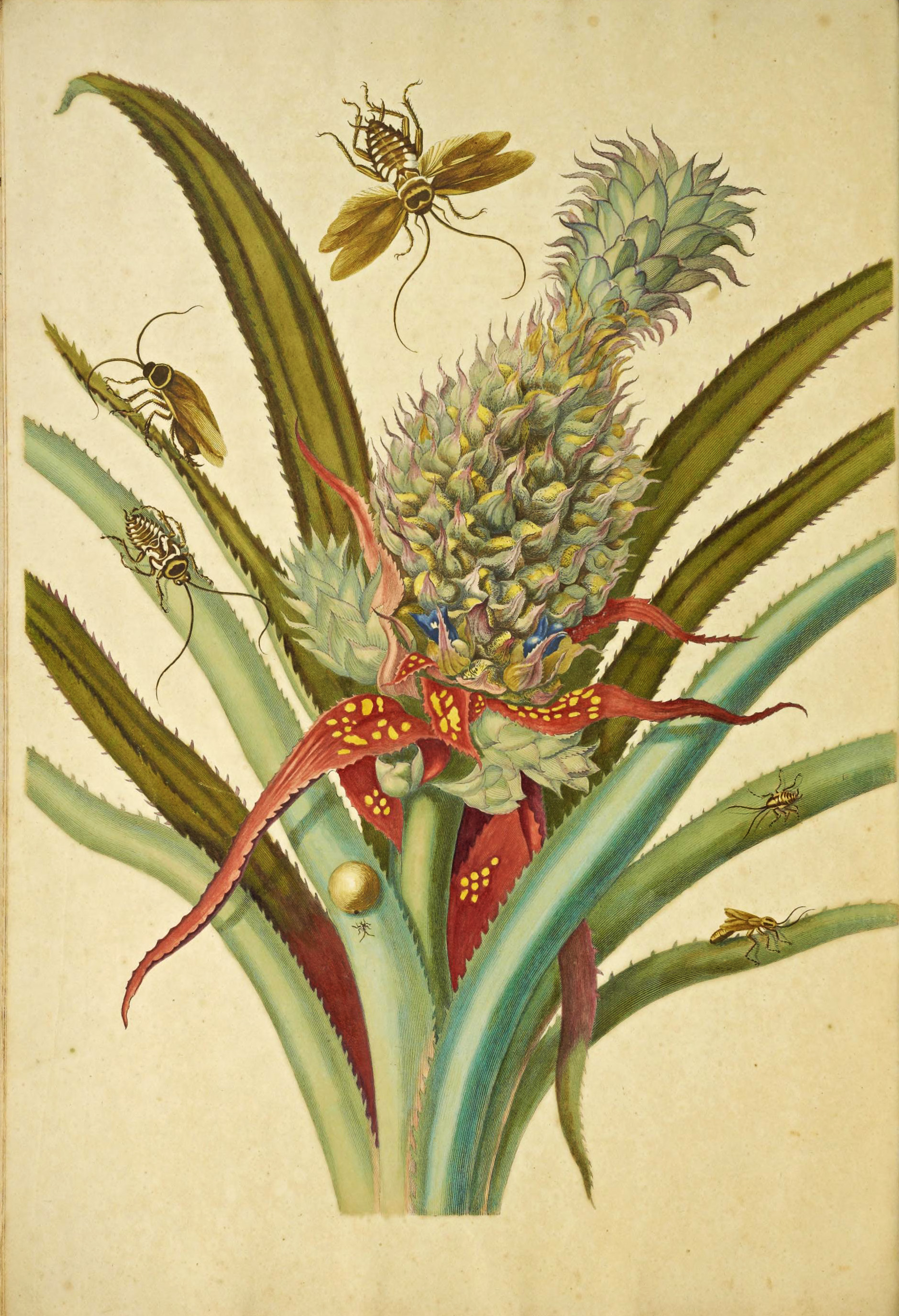 Merian was a pioneering female scientist who traveled to Dutch Surinam to study tropical insects. The pineapple drawing is from the book she published on her return in 1705 ” Metamorphosis insectorum Surinamensium.”