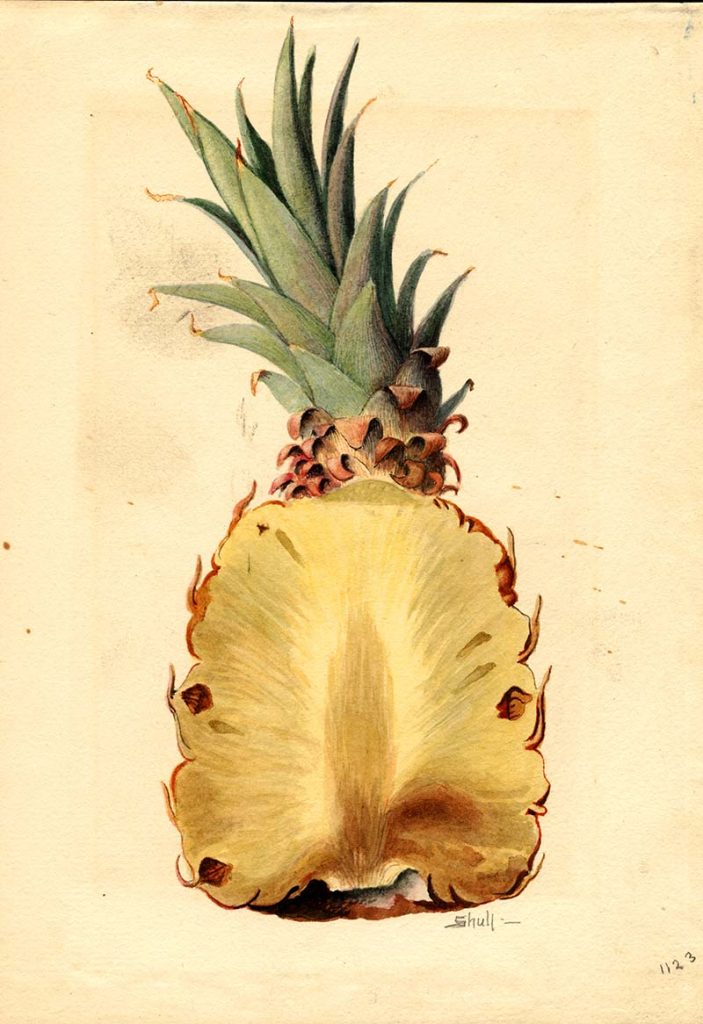 A beautiful watercolor of an open pineapple from the Pomological Watercolor Collection. Pineapple painting by James Shull 1919