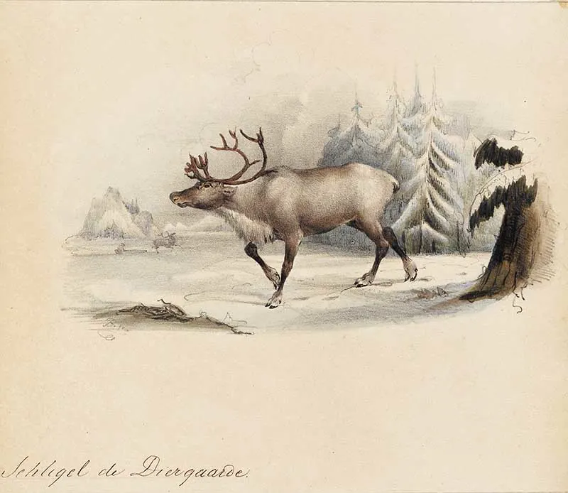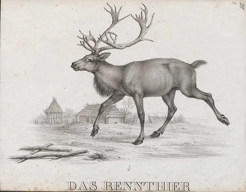 A lovely print of a reindeer in its winter setting. The illustration is from 1842 approximately.