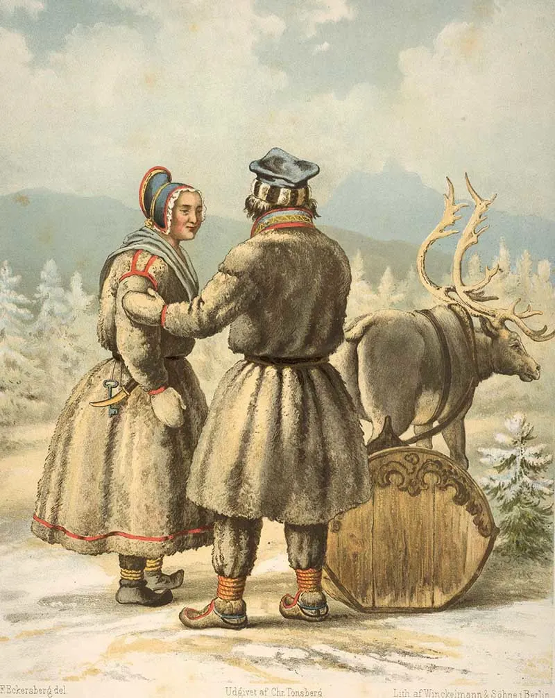 1852 painting of Sami people in winter garments in Karasjok, Norway with reindeer.