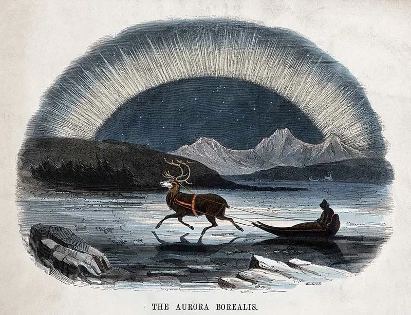 The Aurora Borealis, with a reindeer-drawn sleigh in the foreground. A Coloured wood engraving by C. Whymper, from the Welcome Collection.