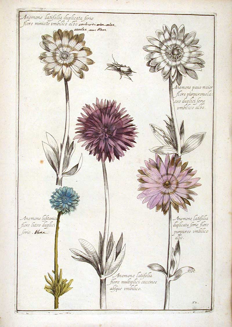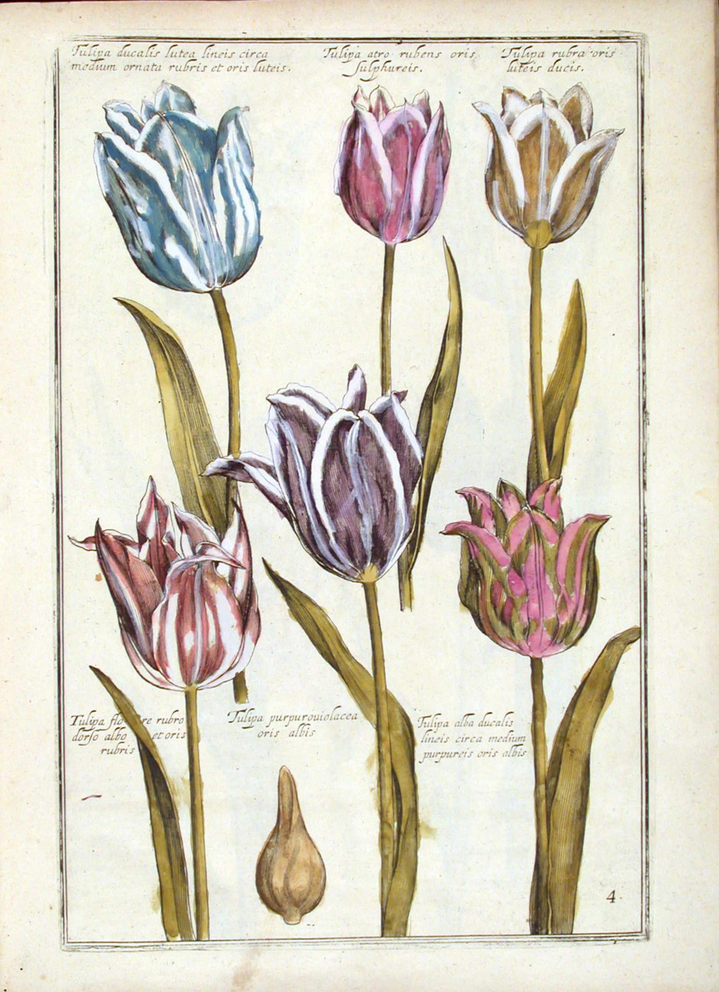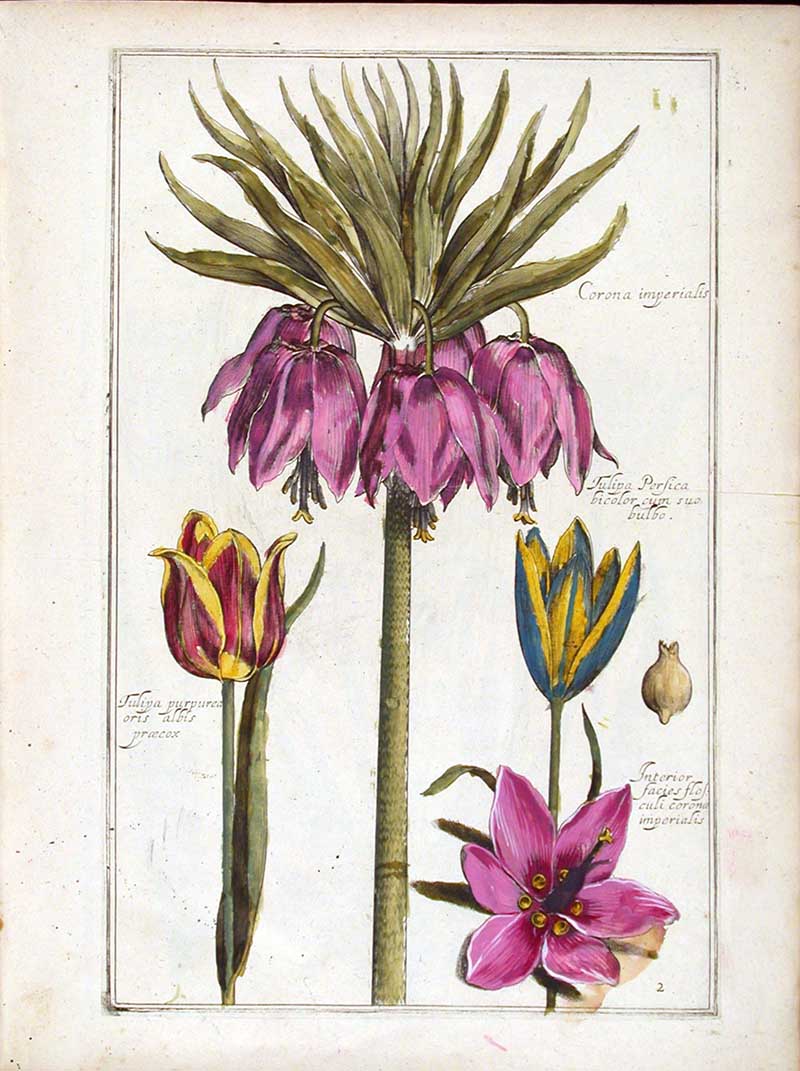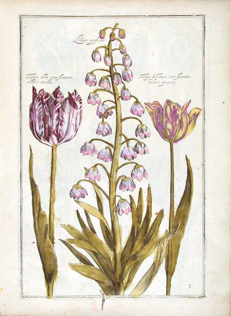 These illustrations showcase the artist’s skill and echo the tulip mania that swept Europe during the period.