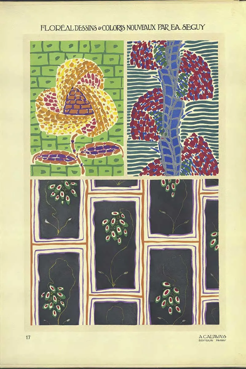 Émile-Allain Séguy’s 1914 collection, Floréal: dessins & coloris nouveaux, is a masterpiece of pochoir printing, featuring 20 vibrant plates of floral-inspired patterns that blend the fluid elegance of Art Nouveau with the geometric boldness of Art Deco.