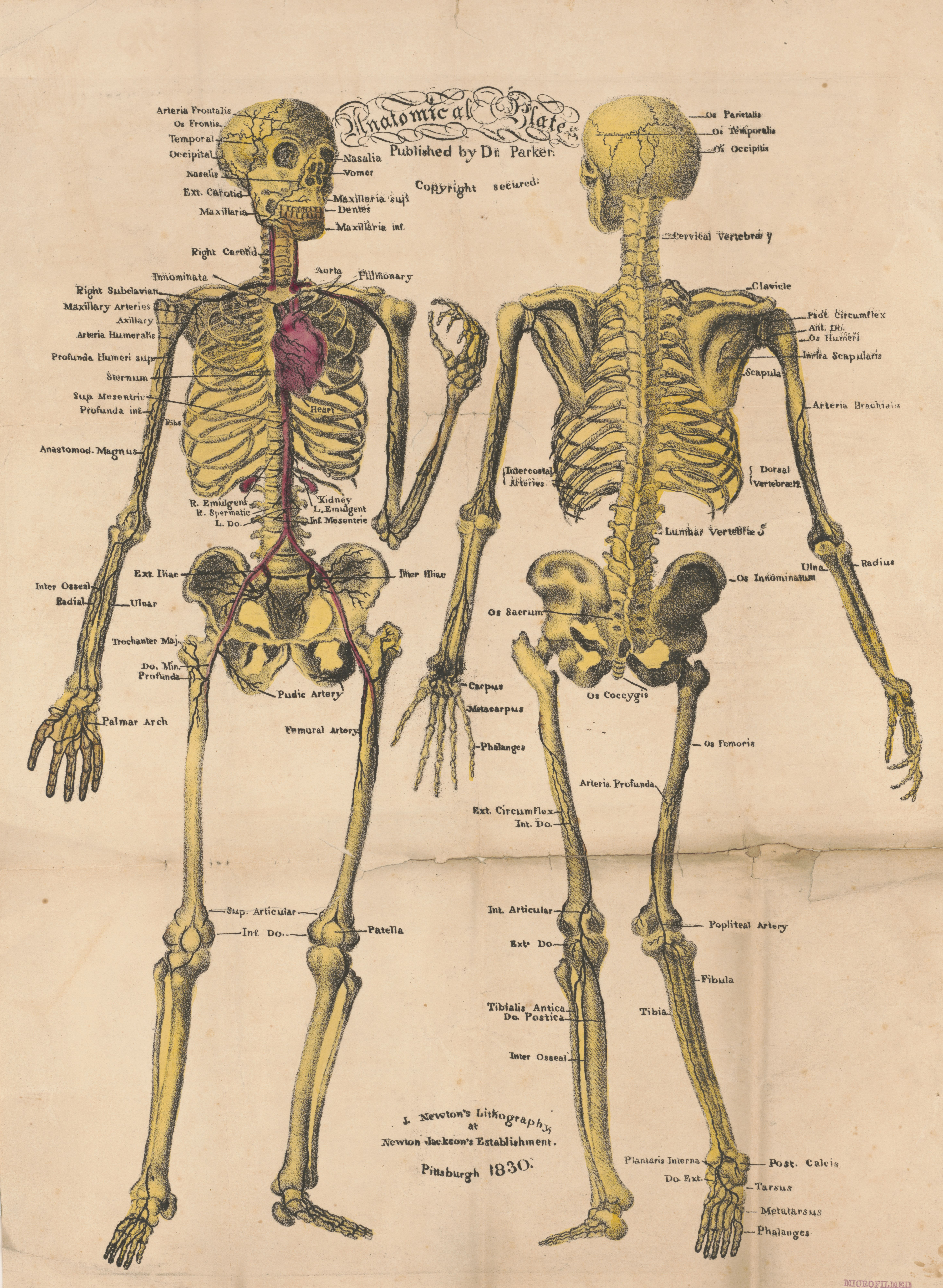Anatomical plates, published by Dr. Parker back and front of skeleton with labeled bones