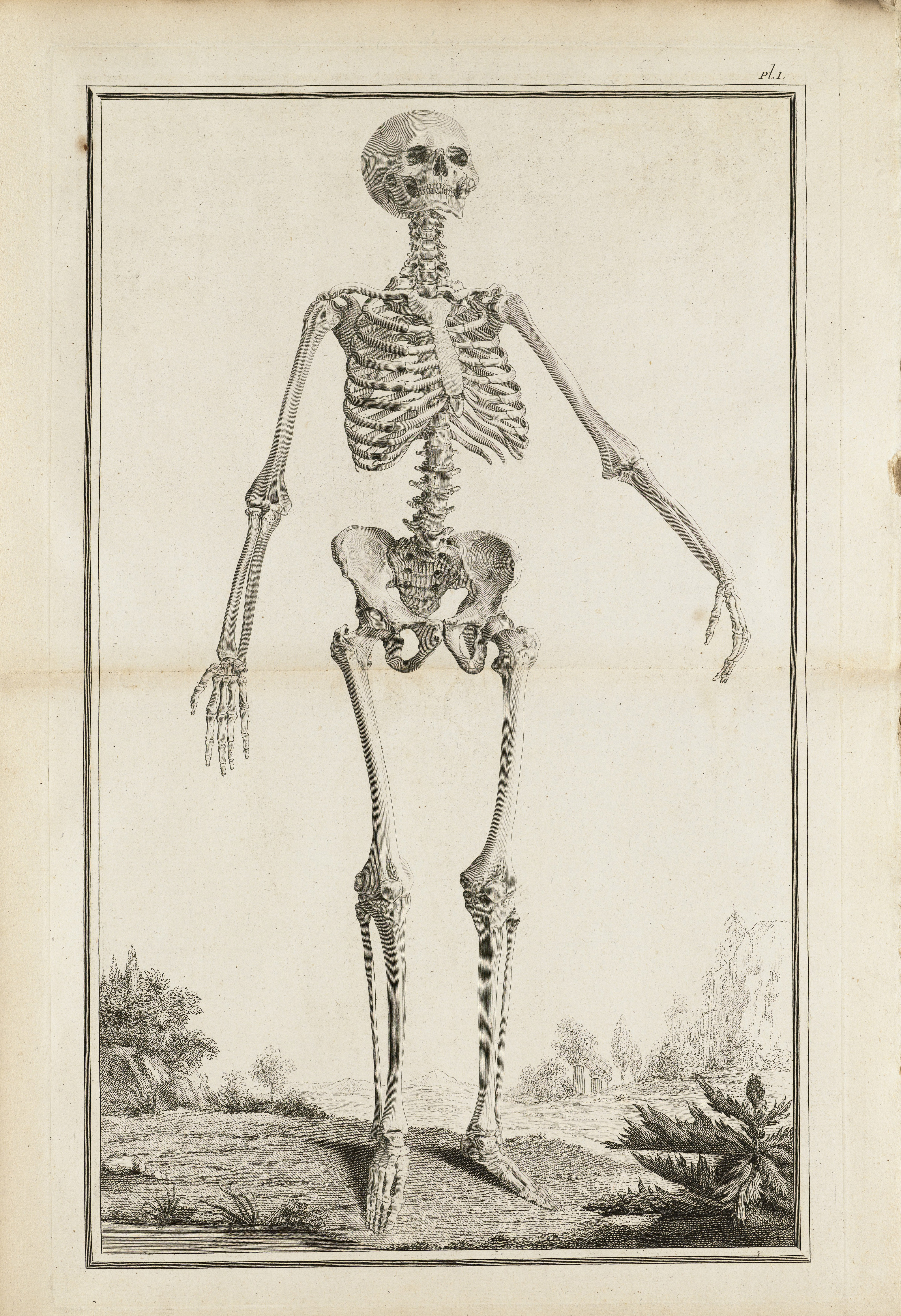 This image is by the Dutch physician and anatomist Govard Bidloo, in 1690. Judging by the size of the skull on this skeleton drawing in relation to the rest of the body, I would think this is a drawing of a child’s skeleton.