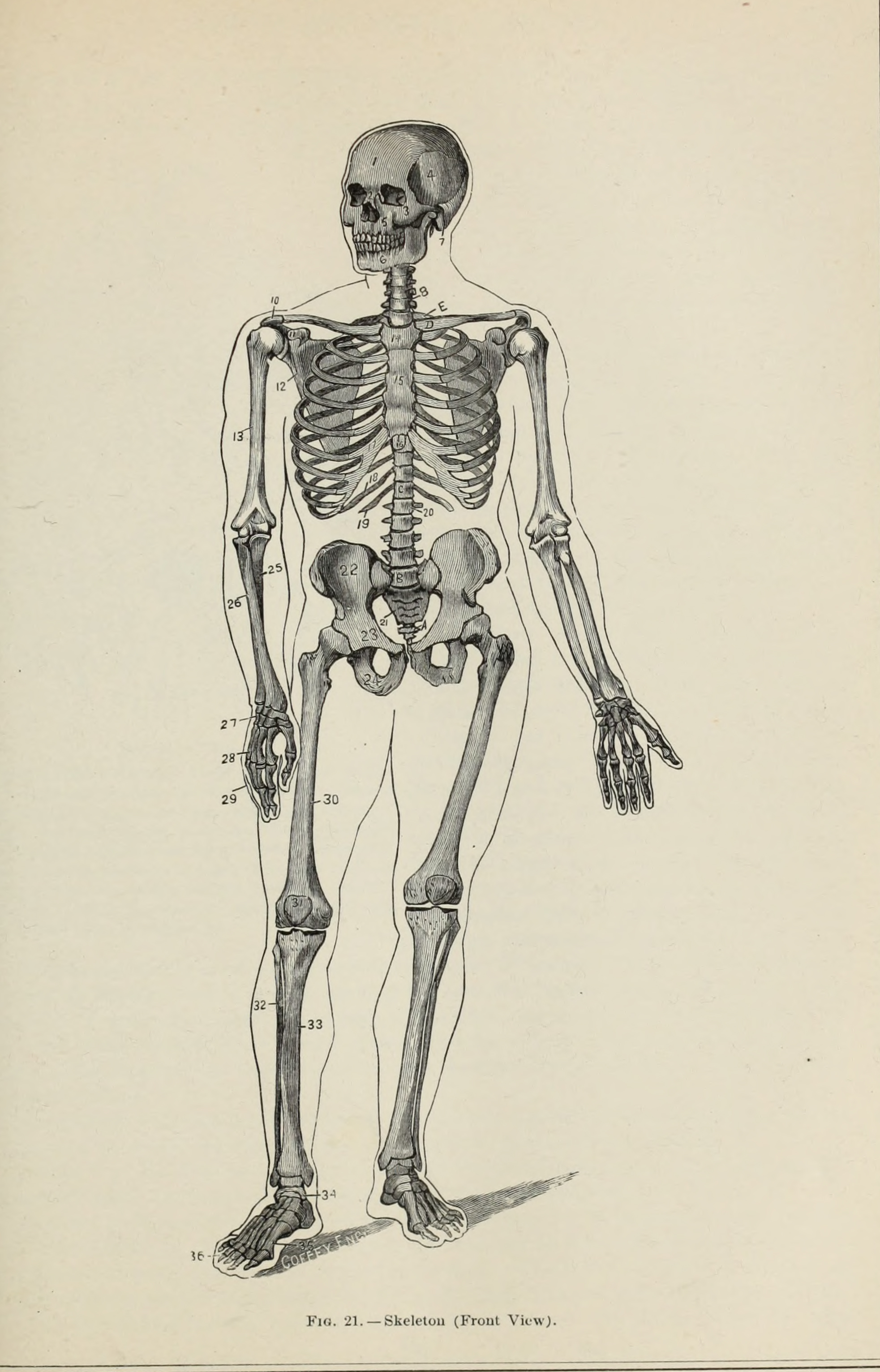 Key: 1. Frontal; 2. Nasal; 3. Malar- 4. Temporal; 5. Superior maxillary, or upper jaw; 0. Inferior maxillary, or lower jaw; 7. Mastoid process; 8. Last cervical vertebra; 9. First dorsal vertebra; 10. Acromion process of the scapula, 12; 11. Coracoid process of the scapula; 12. Scapula; 13. Humerus; 14. Manubrium, or first piece of sternum; 15. Sternum, or breast-bone ; 10. Ensiform, or third piece ; 17 Cartilage of sixth rib ; 18. Eleventh rib ; 19. Twelfth rib ; 20. First lumbar vertebra; 21. Sacrum; 22, 23, 24. Pelvis, 22. Ilium, 23. Pubes; 24. Ischium; 25. Ulna; 20. Radius; 27. Carpus ; 28. Metacarpus; 29. Phalanges ; 30. Femur ; 31. Patella ; 32. Fibula; 33. Tibia ; 34. Tarsus , 35. Metatarsus ; 36. Phalanges.