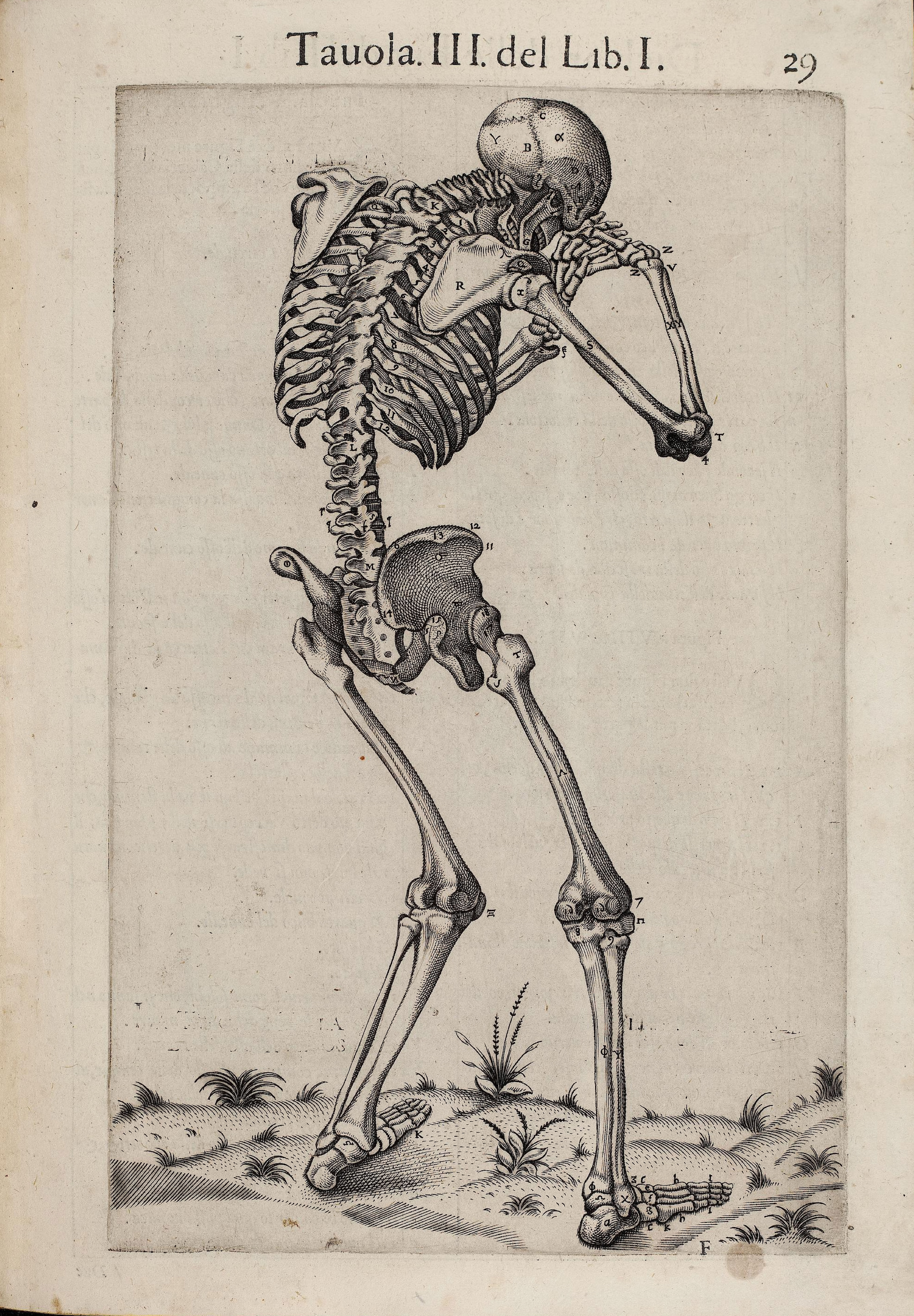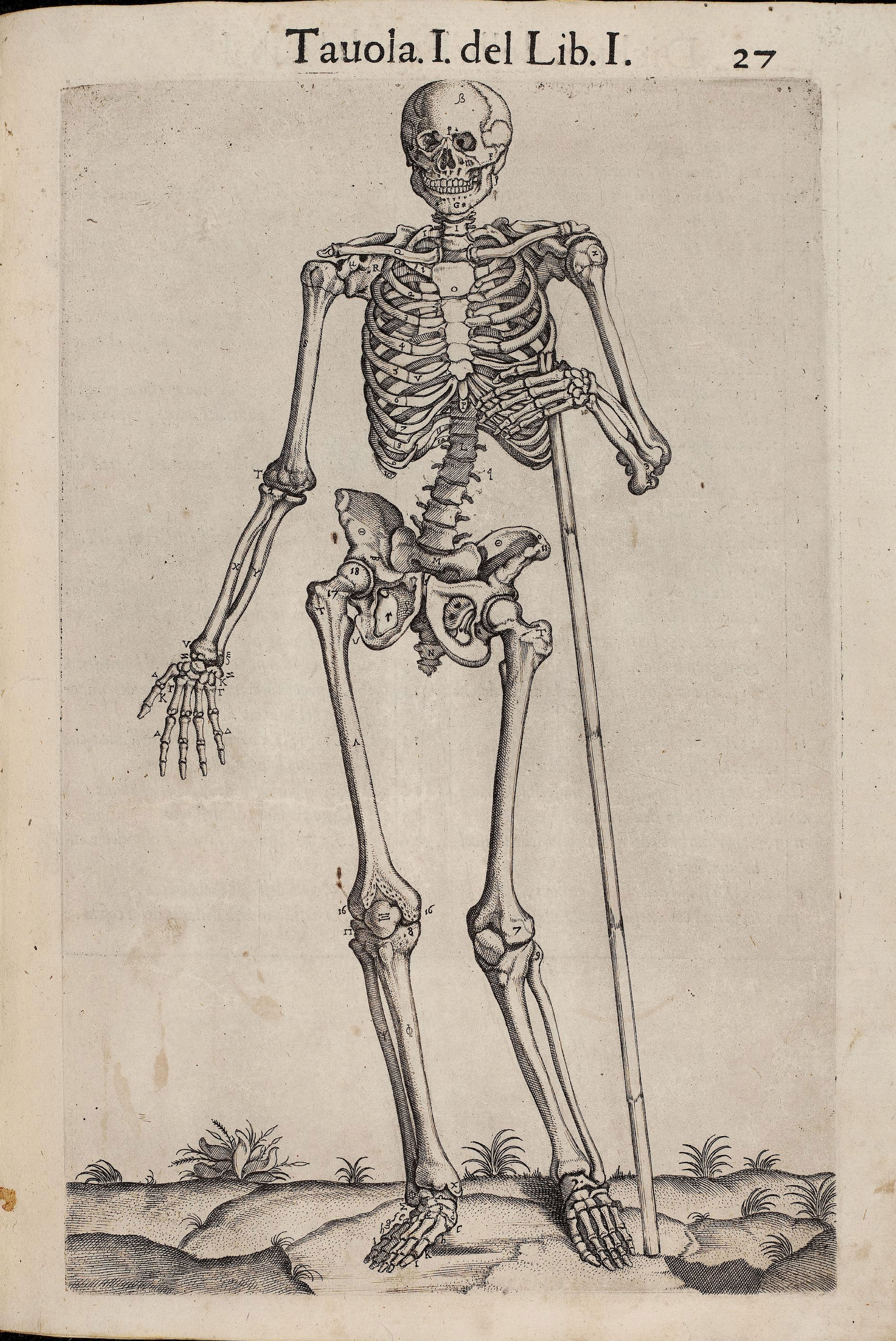 This and then following two vintage skeleton illustrations are from “Anatomia del corpo humano” by Valverde, Juan de, 1560.