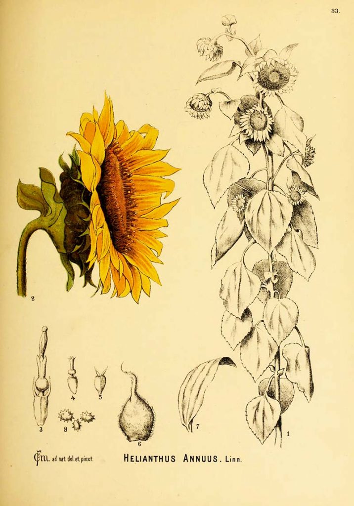A botanical illustration of the sunflower from the book “American medicinal plants; an illustrated and descriptive guide to the American plants used as homeopathic remedies: their history, preparation, chemistry and physiological effects. By Charles F. Millspaugh” (1887)