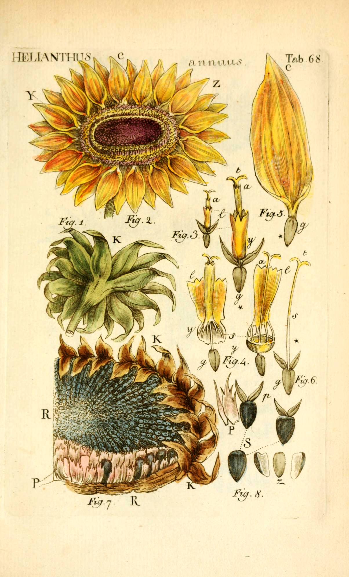 A detailed natural history illustration of a dissected sunflower. These sunflower drawings are from a book showing the sexual system of plants, “