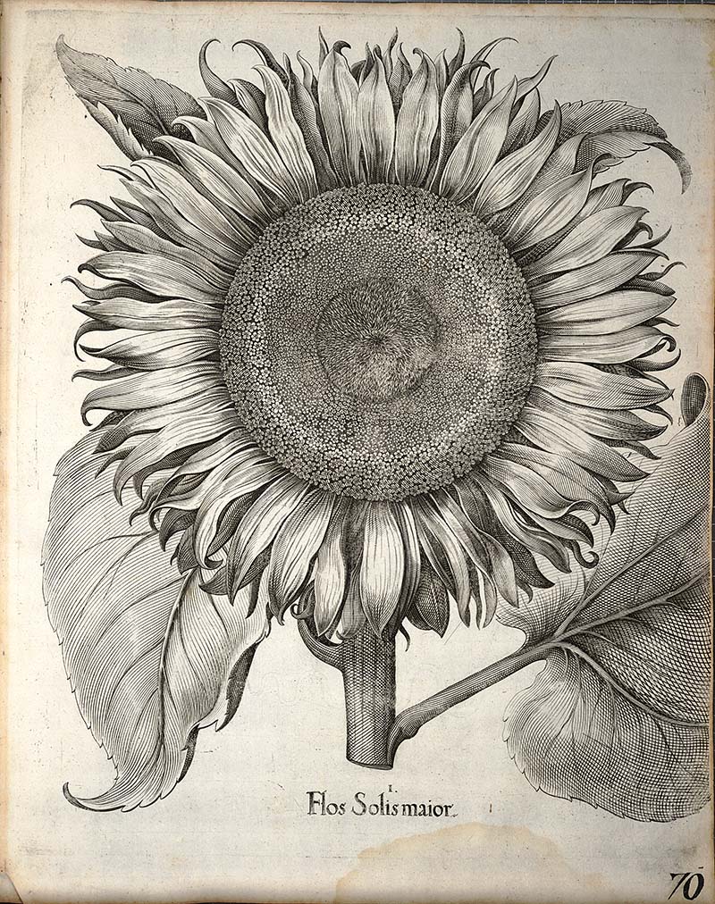 The Hortus Eystettensis is a codex produced by Basilius Besler in 1613 of the garden of the bishop of Eichstätt in Bavaria. There are two versions of this large sunflower drawing: this colourful one and another below in black and white.