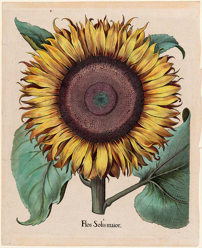 A sunflower illustration from the 17th Century by Hans-Simon Holtzbecker. Holtzbecker was known for his flower paintings, he created on behalf of Duke Friedrich III for the seminal Gottorfer Codex. A four-volume plant atlas.